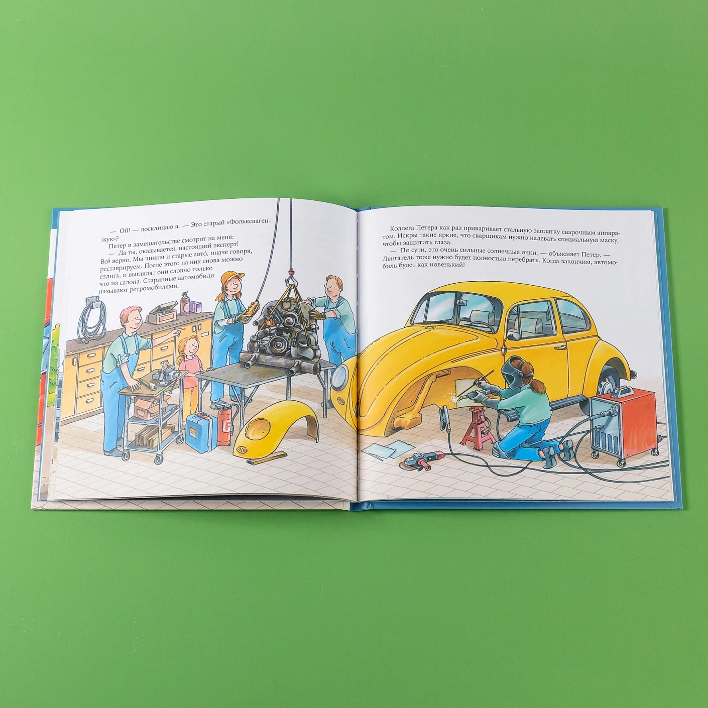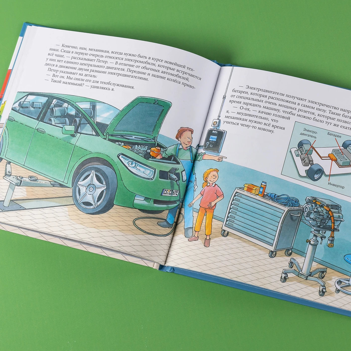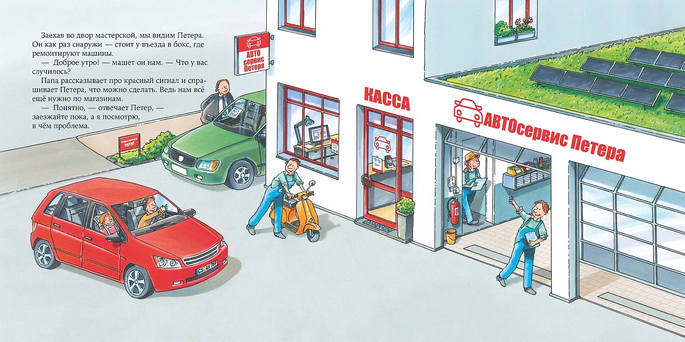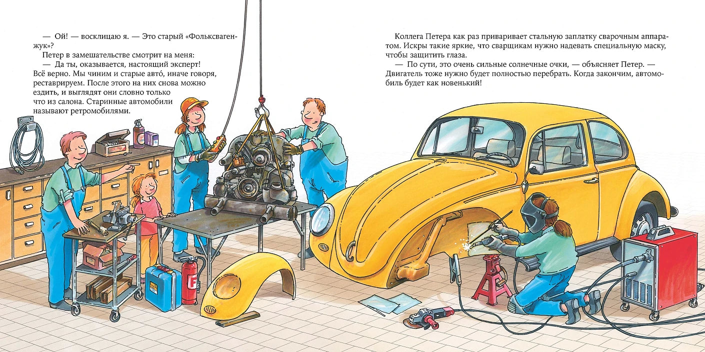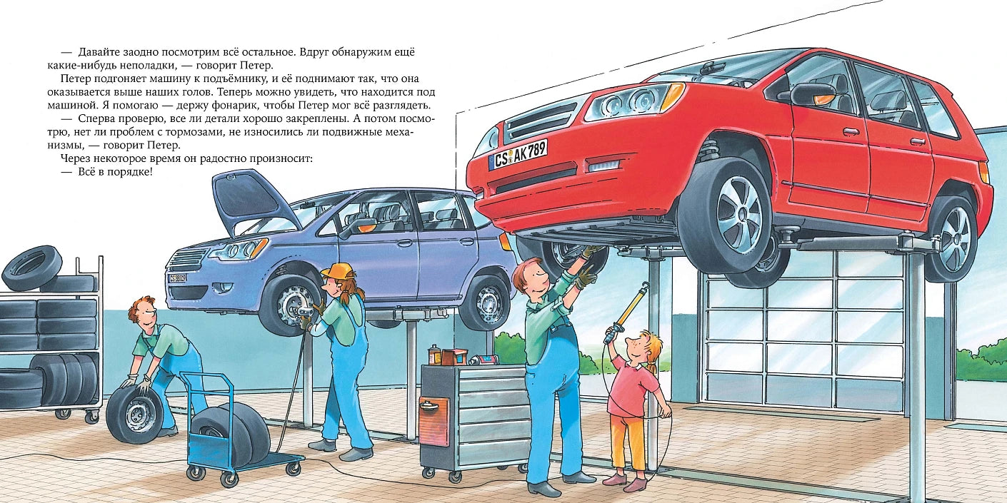 Все книги построены по принципу «один день из жизни...»: герои историй, дети, приходят в гости на работу к своим взрослым знакомым. В этой книге девочка Лилли вместе с соседом Петером знакомится с профессией автомеханика. Вы узнаете, что происходит в ремзоне, для чего нужен подъёмник, что такое балансировочный стенд и многое другое!