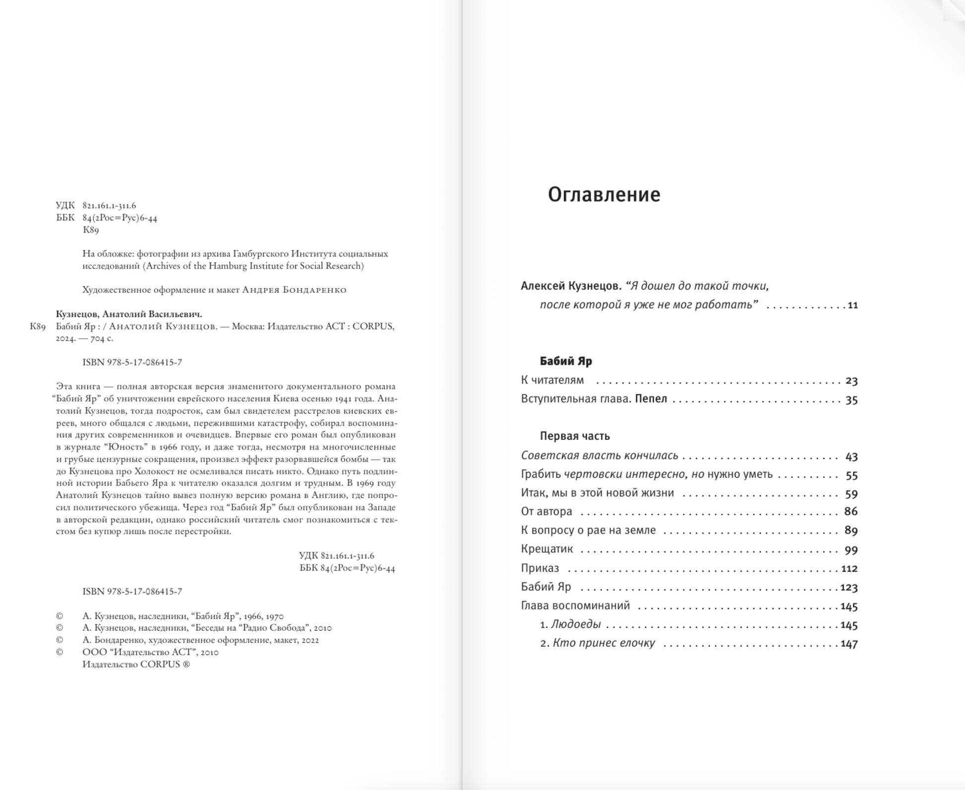 Эта книга - полная авторская версия знаменитого документального романа "Ба­бий Яр" об уничтожении еврейского населения Киева осенью 1941 года. Анатолий Кузнецов, тогда подросток, сам был свидетелем расстрелов киевских евреев, мно­го общался с людьми, пережившими катастрофу, собирал воспоминания других современников и очевидцев. Впервые его роман был опубликован в журнале "Юность" в 1966 году, и даже тогда, несмотря на многочисленные и грубые цен­зурные сокращения, произвел эффект разорвавшейся бомбы - так до Кузнецова про Холокост не осмеливался писать никто. Однако путь подлинной истории Ба­бьего Яра к читателю оказался долгим и трудным. В 1969 году Анатолий Кузнецов тайно вывез полную версию романа в Англию, где попросил политического убе­жища. Через год "Бабий Яр" был опубликован на Западе в авторской редакции, од­нако российский читатель смог познакомиться с текстом без купюр лишь после пе­рестройки.
