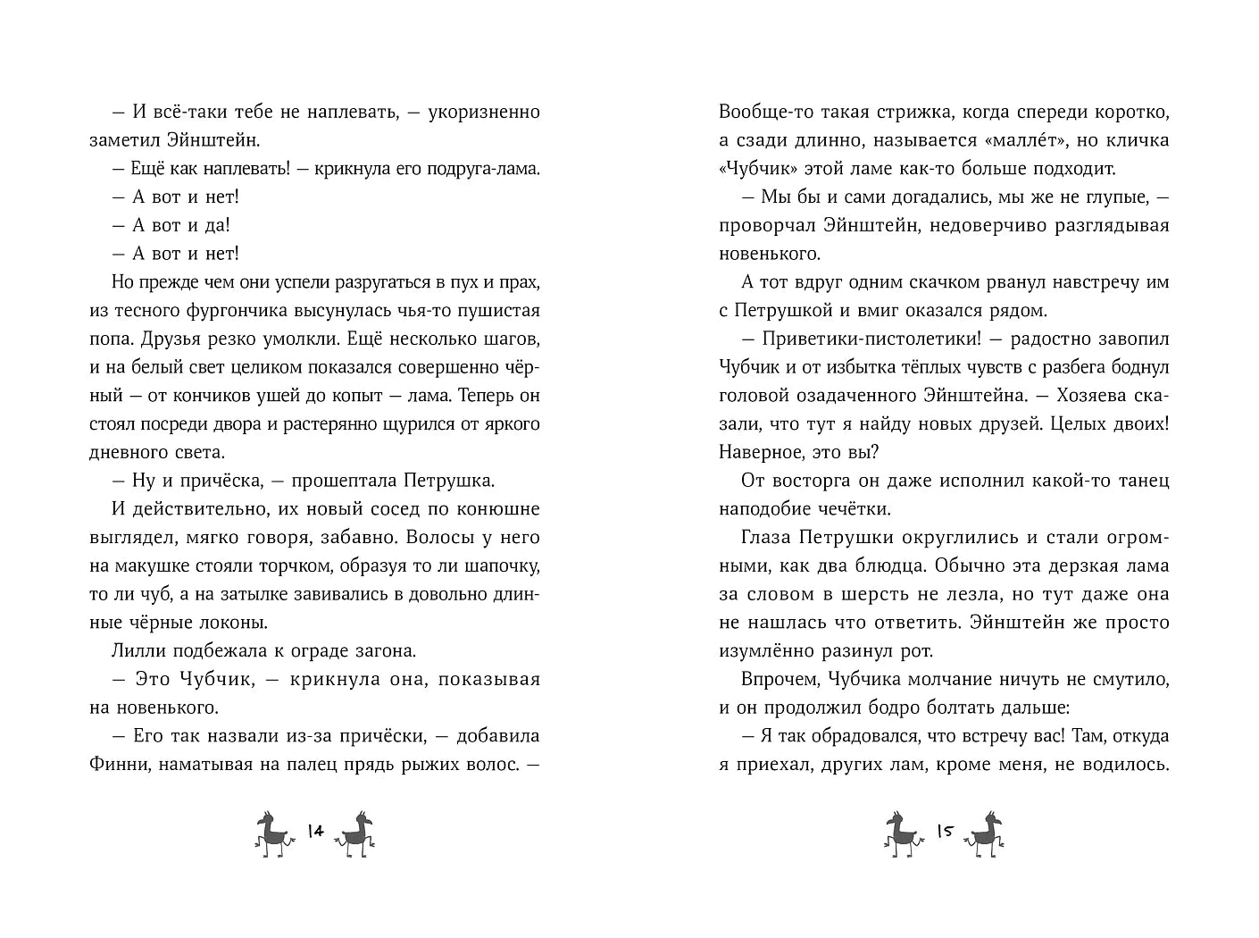 Эйнштейн — коричневая пятнистая лама, умен и рассудителен, любит спокойствие и комфорт. Петрушка — белоснежная альпака с шикарной прической; любит изображать диву. Чубчик — веселая черная лама, который получил свое имя благодаря странной прическе.