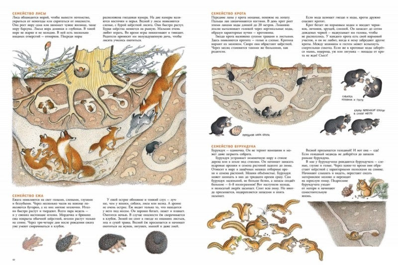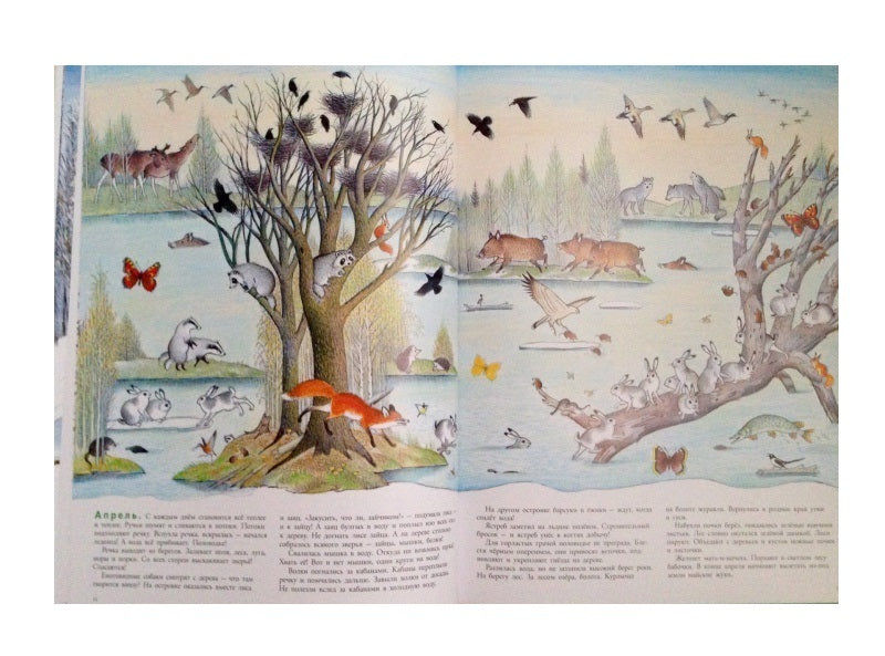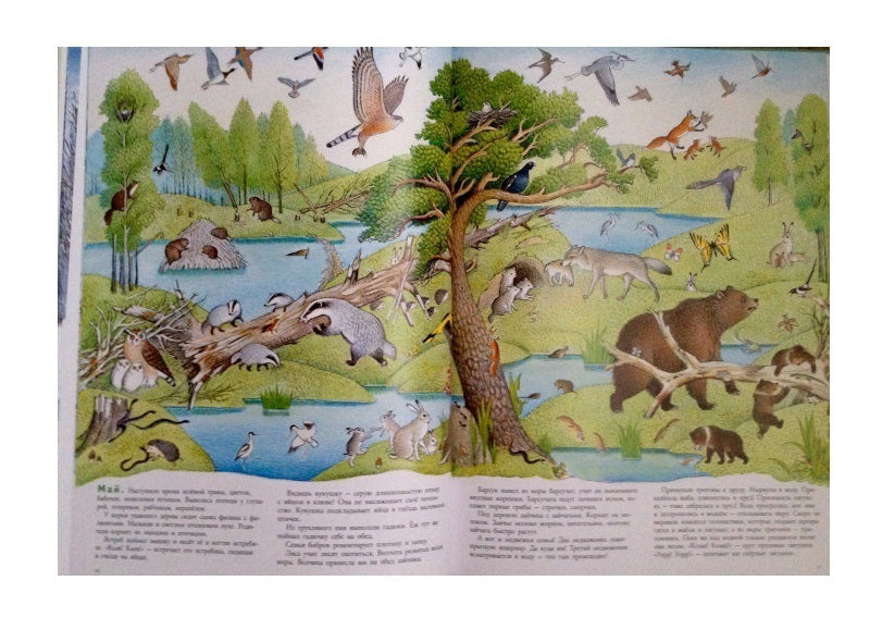 Разворотные иллюстрации, посвящённые каждому месяцу в году, не просто выразительны и живописны, они еще и абсолютно точны с зоологической точки зрения. За зимой приходит весна, вслед за весной - лето и осень… Вокруг маленького читателя ходят медведи, олени, лоси, белки, лисы, зайчата, рыси. Птицы строят гнезда, звери роют норы. Птенцы выбираются из яиц, головастики - из икринок, зверята сосут материнское молоко.