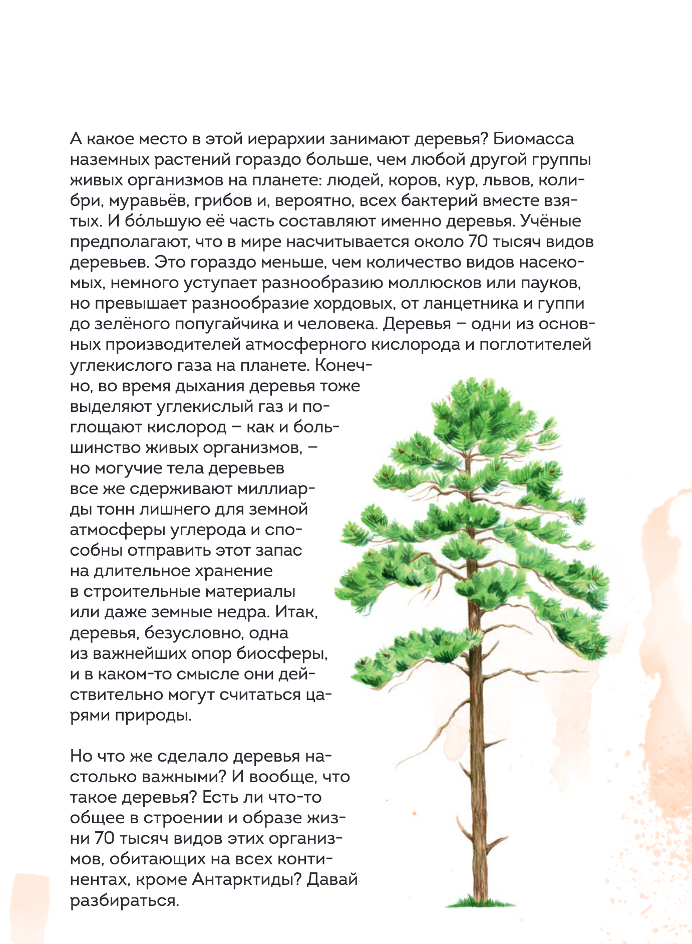 В этой красивой книге вы найдете более 45 видов российских деревьев — в том числе самые древние, прочные, редкие и даже самые вредные! Вы узнаете, что отличает деревья от других растений, научитесь определять виды по кроне, листьям или коре, разберетесь, как устроена экосистема леса и как человек взаимодействует с деревьями с древности до наших дней. Практический раздел расскажет о ремеслах, связанных с деревьями, — о плетении из бересты, резьбе и выжигании по дереву.