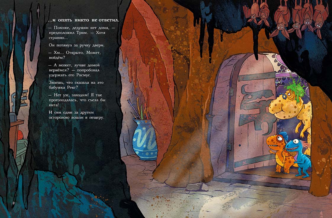 Каждая книга серии «Друзья-динозаврики» рассказывает об одном дне из жизни тираннозаврика Расмуса Рекса и его лучшего друга Трима Троодона. В то утро Трим разбудил Расмуса ни свет ни заря. Оказывается, семейство Рексов и семейство Троодонов давно договорились отправиться сегодня к дедушке Трима! А Расмус совершенно об этом забыл. Ему страшно не хотелось тащиться в такую даль, к подножию Туманных гор. И для чего? Чтобы все лето просидеть в какой-то темной пещере! Но уговор есть уговор, и, конечно, Расмус тоже пошел со всеми. Когда же путешественники добрались наконец до места, дедушки они там не увидели, зато обнаружили письмо. В послании говорилось, что найти деда Трима, а заодно узнать его тайну можно, только пройдя квест по лабиринту коридоров, темных закоулков, спусков и подъемов огромной пещеры хозяина – самого большого выдумщика на свете!