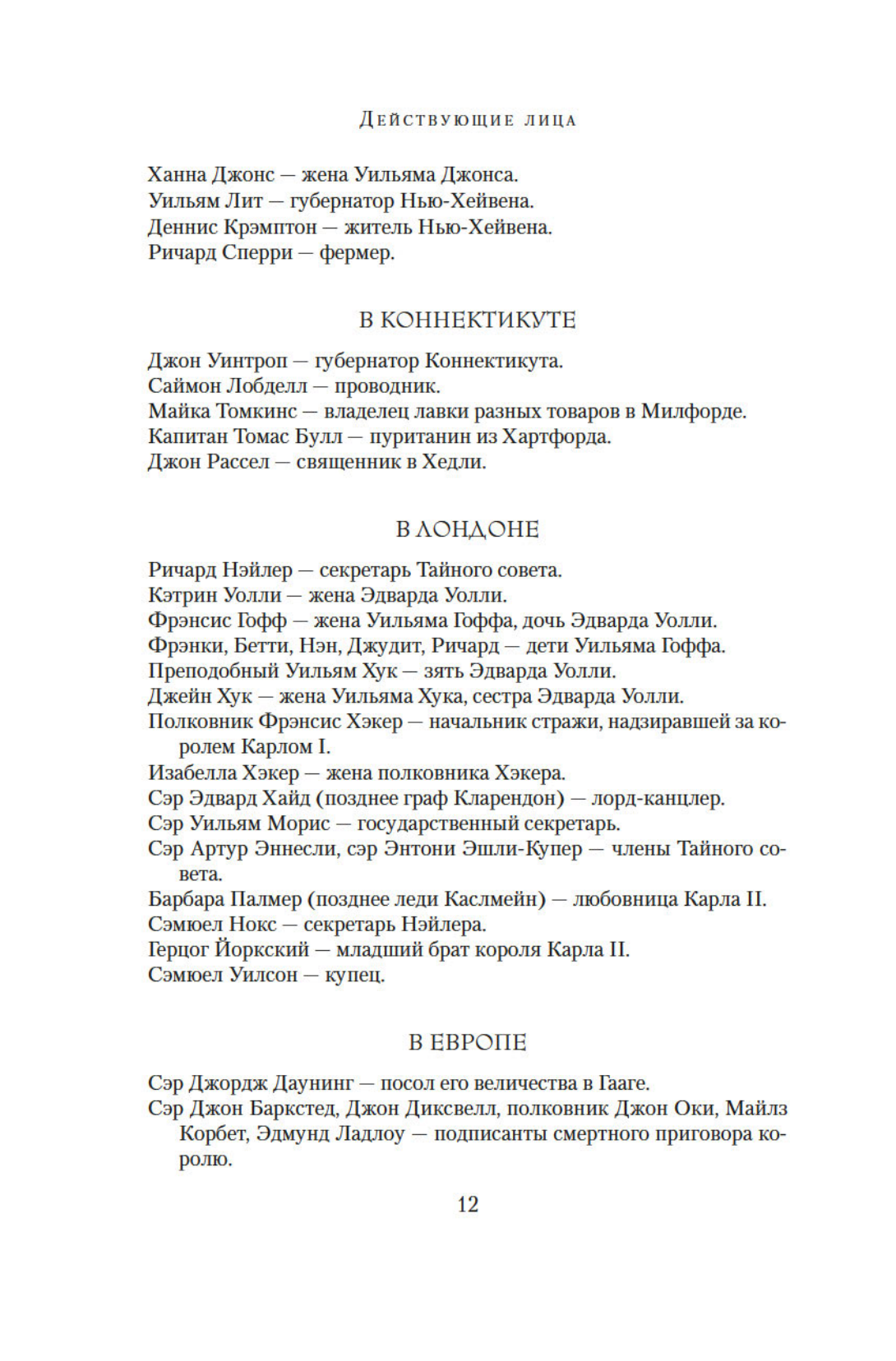 Бурным выдался в истории Англии семнадцатый век. В 1649 году мятежники Кромвеля прилюдно отрубили Карлу I голову, а в 1660-м на престол взошел сын монарха, Карл II. Чтобы положить конец круговороту расправ, был принят закон, дарующий прощение всем участникам гражданской войны. Всем, кроме тех, кто подписал смертный приговор королю. Этих людей преследуют, ловят и подвергают жестокой казни. Двое из них, преданные сторонники Кромвеля, полковники Эдвард Уолли и Уильям Гофф, спасая жизнь, бегут на самый край света. Но даже там им не скрыться от проницательного Ричарда Нэйлера, чиновника Тайного совета, имеющего личные счеты к цареубийцам. Впервые на русском!