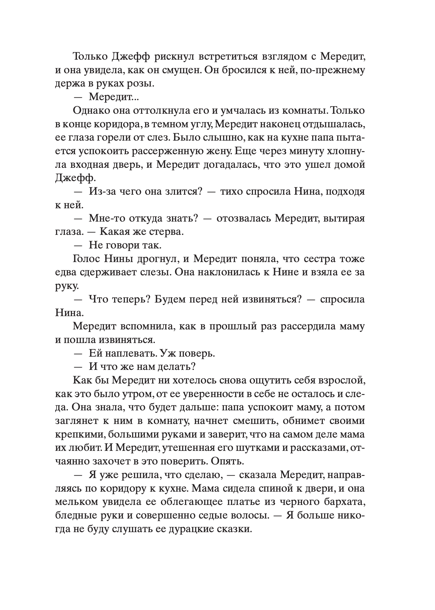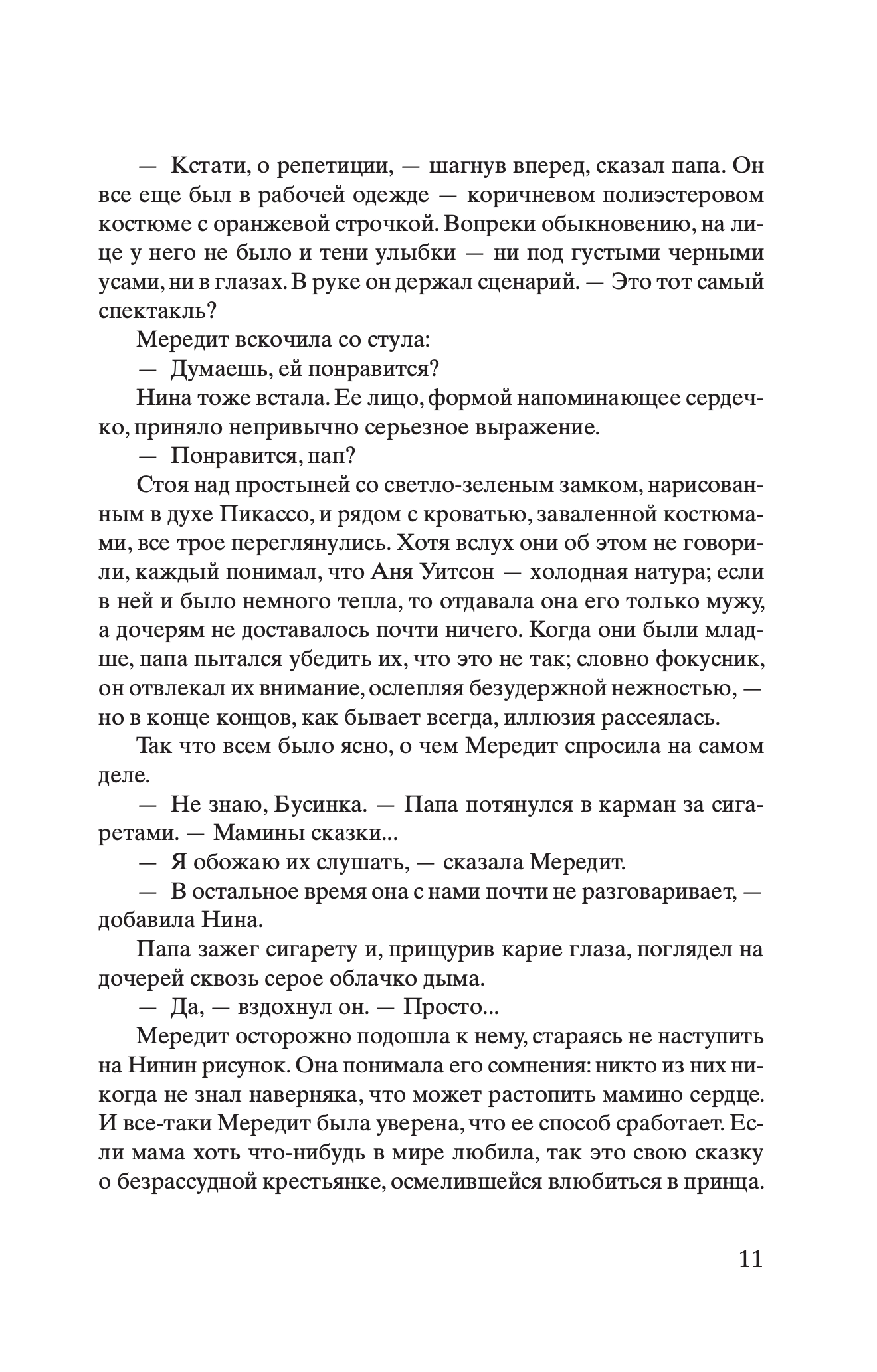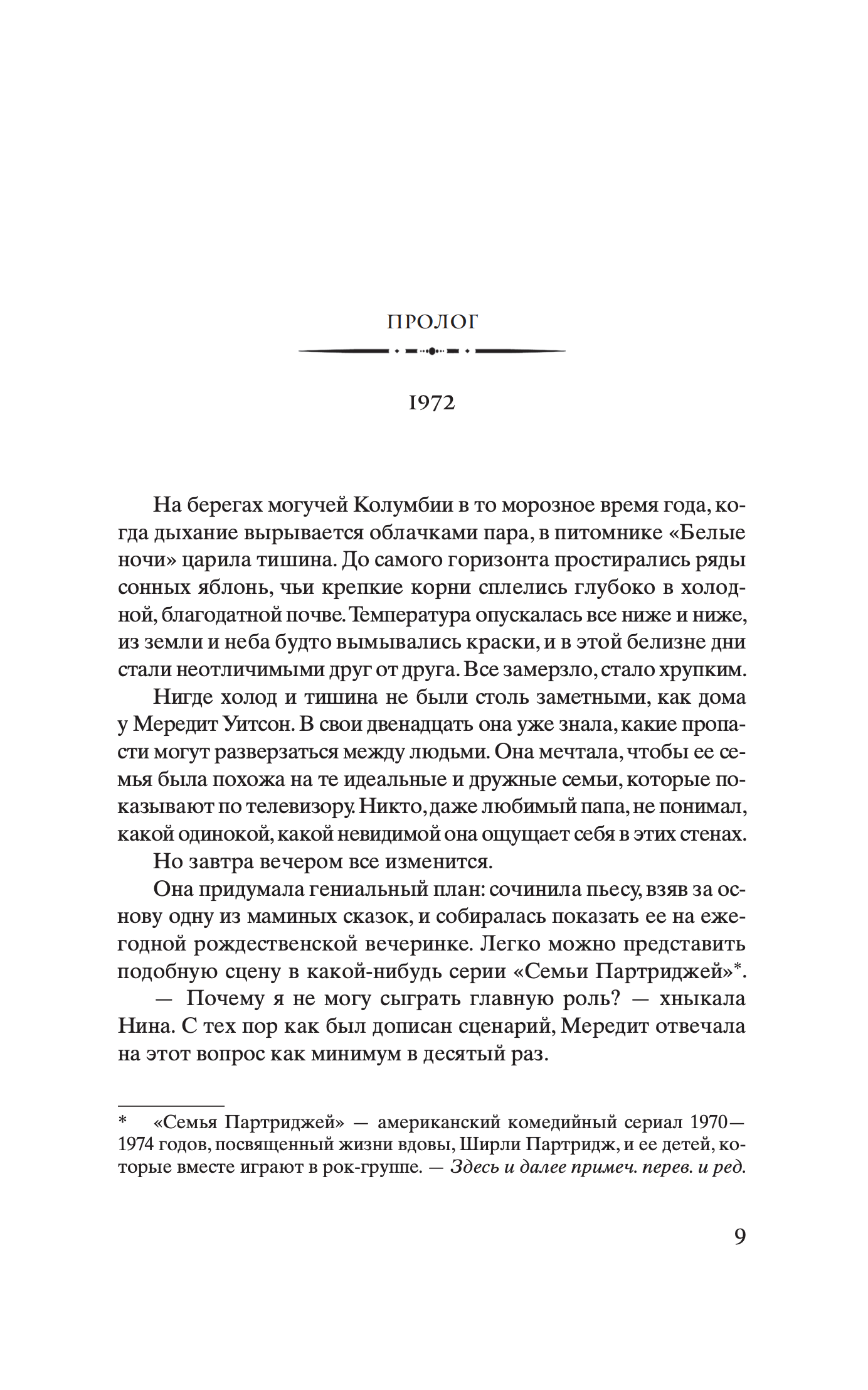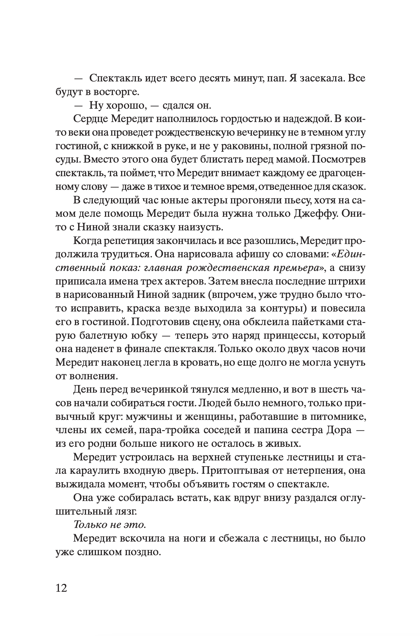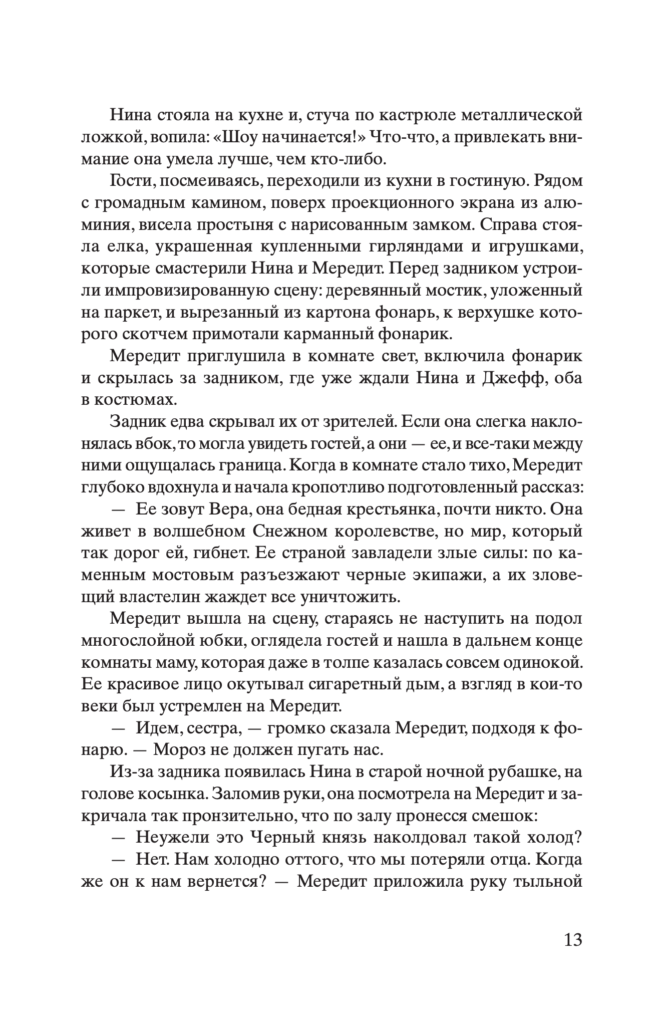 Мередит и Нина Уитсон — сестры, но трудно найти женщин более непохожих. Одна – домоседка, всегда считавшая, что нет лучшей судьбы, чем выйти замуж, растить детей и управлять семейным яблоневым питомником. Другая мечтала о странствиях, стала фоторепортером, освещающим гуманитарные катастрофы, и мотается по всему миру, избегая разговоров о будущем и семье. Болезнь отца сводит сестер вместе в родительском доме. От матери с русскими корнями они никогда не видели ничего, кроме ледяного неодобрения, и даже сейчас Аня не пытается сблизиться с дочерями, проявляя хорошо знакомую им отстраненность. В детстве только одно объединяло их с матерью: сказка про бедную девушку и принца, которую та рассказывала девочкам на ночь. Понимая, что умирает, отец просит дочерей дослушать сказку — до самого конца. Так начинается путешествие двух женщин в прошлое матери, в ее жизнь в блокадном Ленинграде, в страшный и красивый ледяной мир.