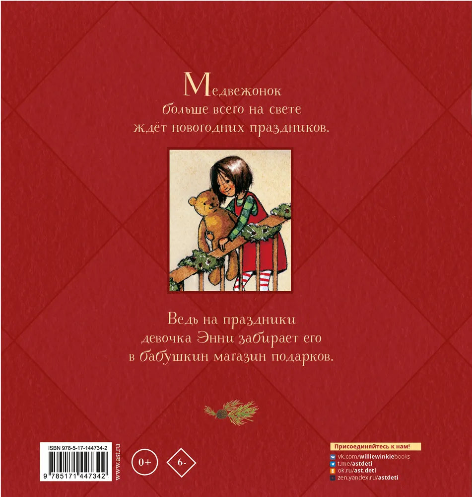 Настоящая новогодняя история о маленькой девочке Энни и её плюшевом медвежонке. Весь год Медвежонок наблюдает с чердака, где живёт, за сменой времён года и ждёт первых снежинок, которые означают приближение новогодних праздников. Ведь на праздники Энни забирает его в магазин подарков своей бабушки. Но вдруг что‑то идет не так — магазинчик закрывается, а будущее всех его обитателей становится очень неопределённым. Трогательная история и тёплые, уютные иллюстрации делают эту книгу настоящей новогодней классикой.