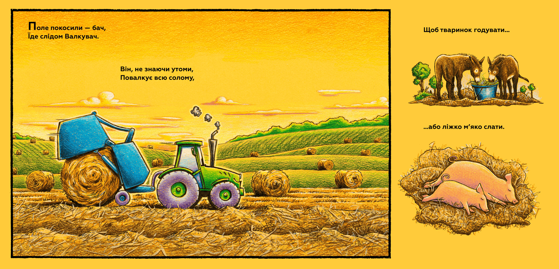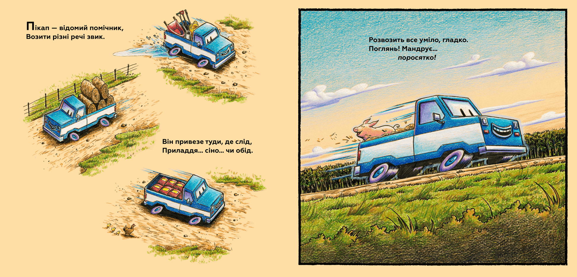 • На сторінках цієї книжки весело і цікаво спостерігати, як поступово змінюються пори роки. Дізнавайтеся, коли і яку роботу на фермі виконує кожна з машинок.