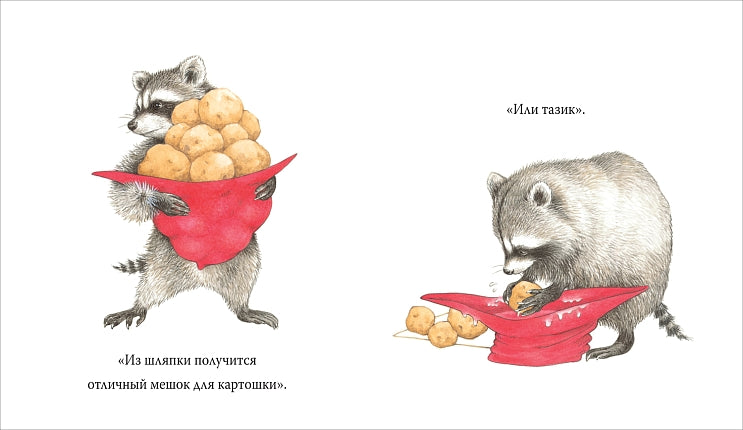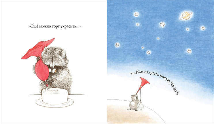 Маленький Енотик играет со шляпой. В ней можно спрятать нос или хвостик. С ней можно полетать по небу, как с парашютом. Из нее даже можно запустить фейерверк. И не беда, если шляпа порвется: она еще может стать и дудкой, и телескопом, и кондитерским шприцем… Правда, шляпа-то мамина. Но мама не будет обижаться — она ведь любит своего Енотика.