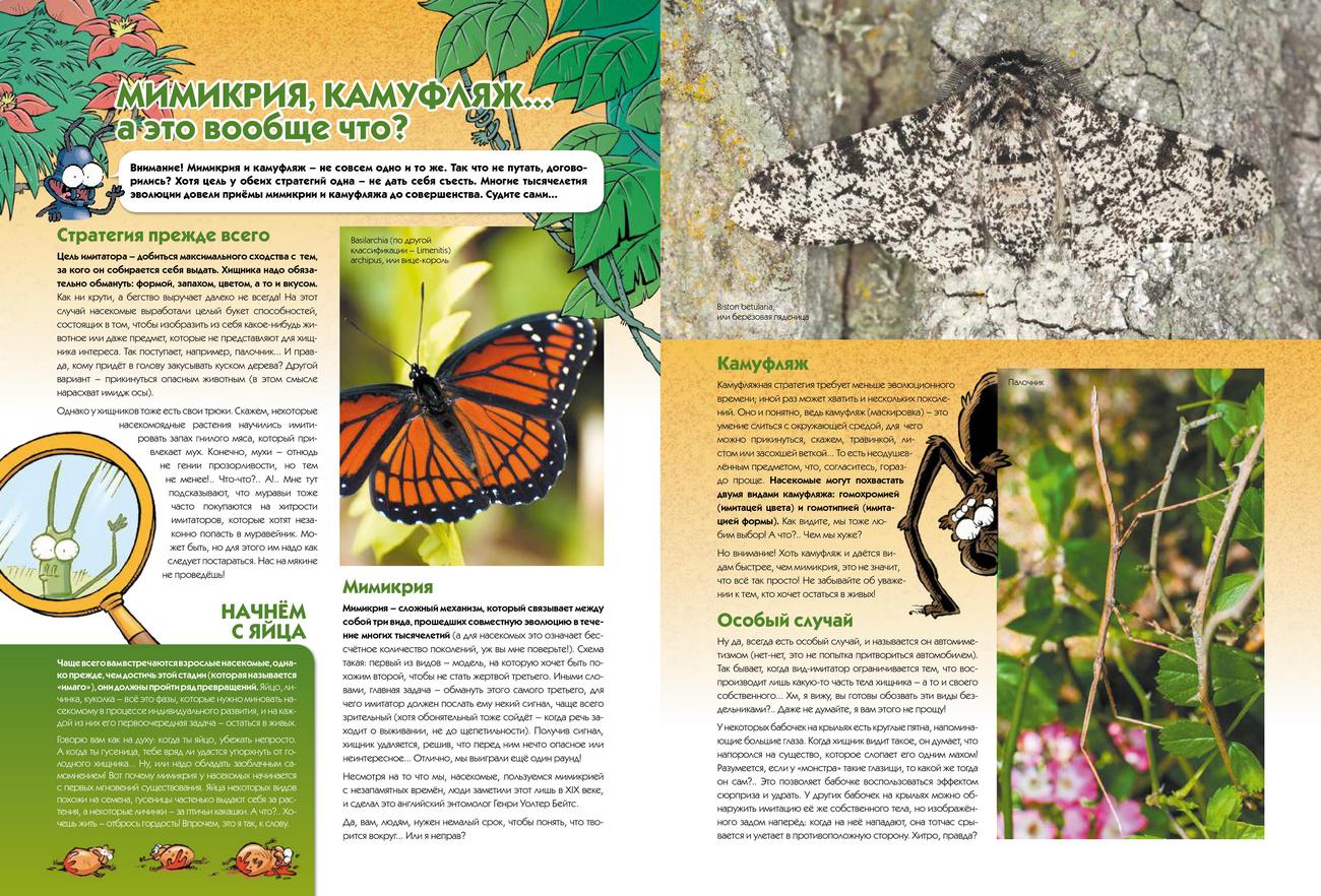 Но и это ещё не всё! Завершает книгу подробная лекция на такую, прямо скажем, животрепещущую для насекомых тему, как мимикрия и камуфляж. Важно отметить, что авторы не стали городить отсебятину, и в качестве основного спикера пригласили специалиста - муравья, который подошёл к делу со всей ответственностью и даже позвал на подмогу своих друзей, настоящих профессионалов: голубянку, берёзовую пяденицу, грязного хищнеца, листовидку и многих, многих других. Уж кто-кто, а они своё дело знают!