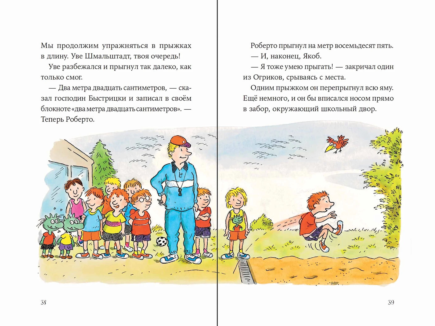 Огрики, конечно, понятия не имели, что такое школа. Они с любопытством прокрались вслед за детьми в здание, прошли через широкую дверь мимо автоматов с какао, потом вдоль стены, на которой висели картинки 2 В класса.