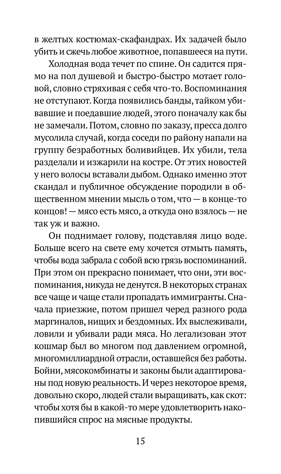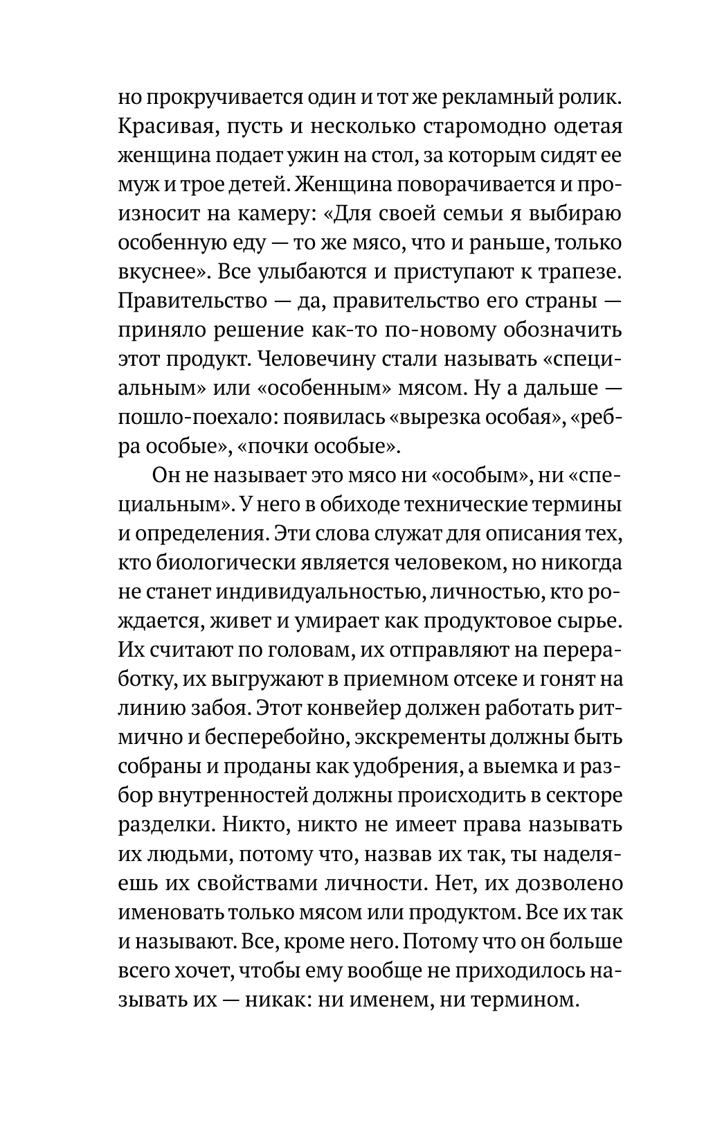 В этой чрезвычайной ситуации, грозящей массовым голодом, правительства разных стран приходят к радикальному решению: легализовать разведение, размножение, убой и переработку человеческой плоти. Узаконенный каннибализм разделяет общество на две группы: тех, кто ест, и тех, кого съедят.