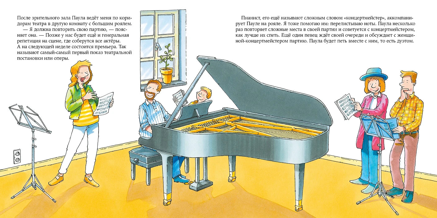 Вот, например, певица. Она может примерить на себя неожиданный образ и исполнить любую песню: грустную, смешную или торжественную. А ещё у певицы самое красивое место работы: театр с яркими креслами и высокими лестницами.