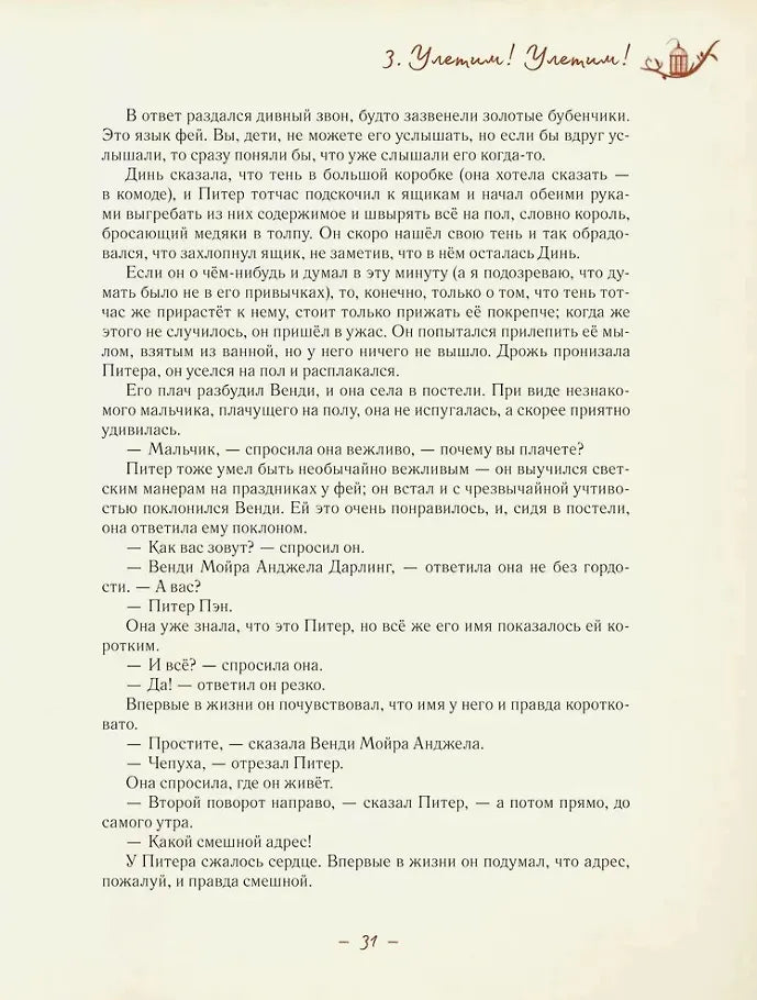 «Питер Пэн и Венди» это удивительная волшебная сказка о необыкновенном мальчике Питере, который умел летать и не желал взрослеть, о девочке Венди и ее братьях, которых Питер увлек за собой, и об их захватывающих приключениях на сказочном Нигдешнем острове. Дополняют издание потрясающие яркие иллюстрации современного испанского художника Антонио Лоренте