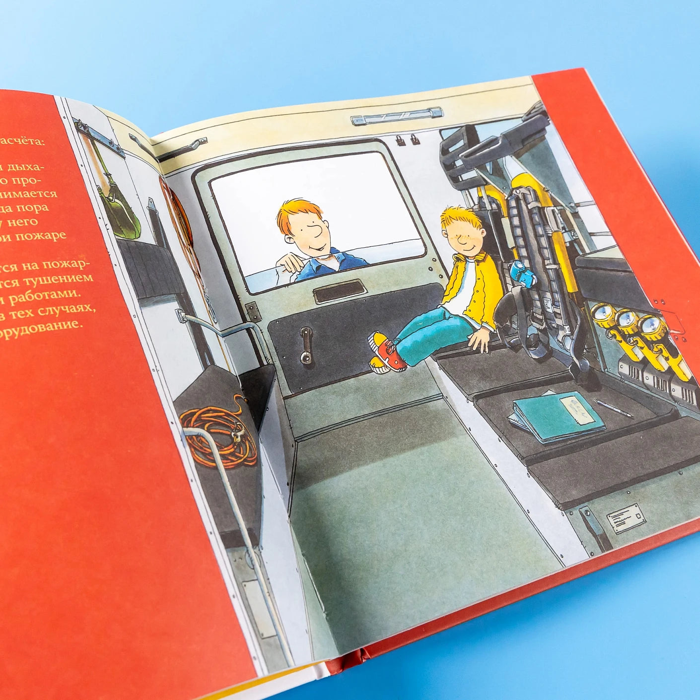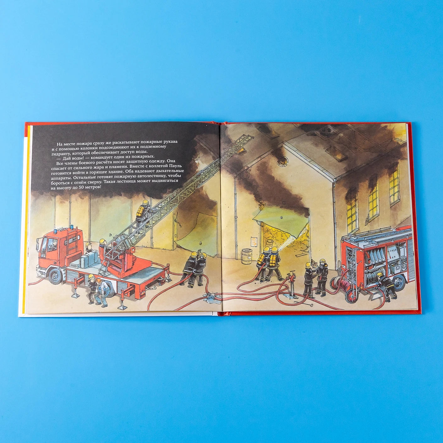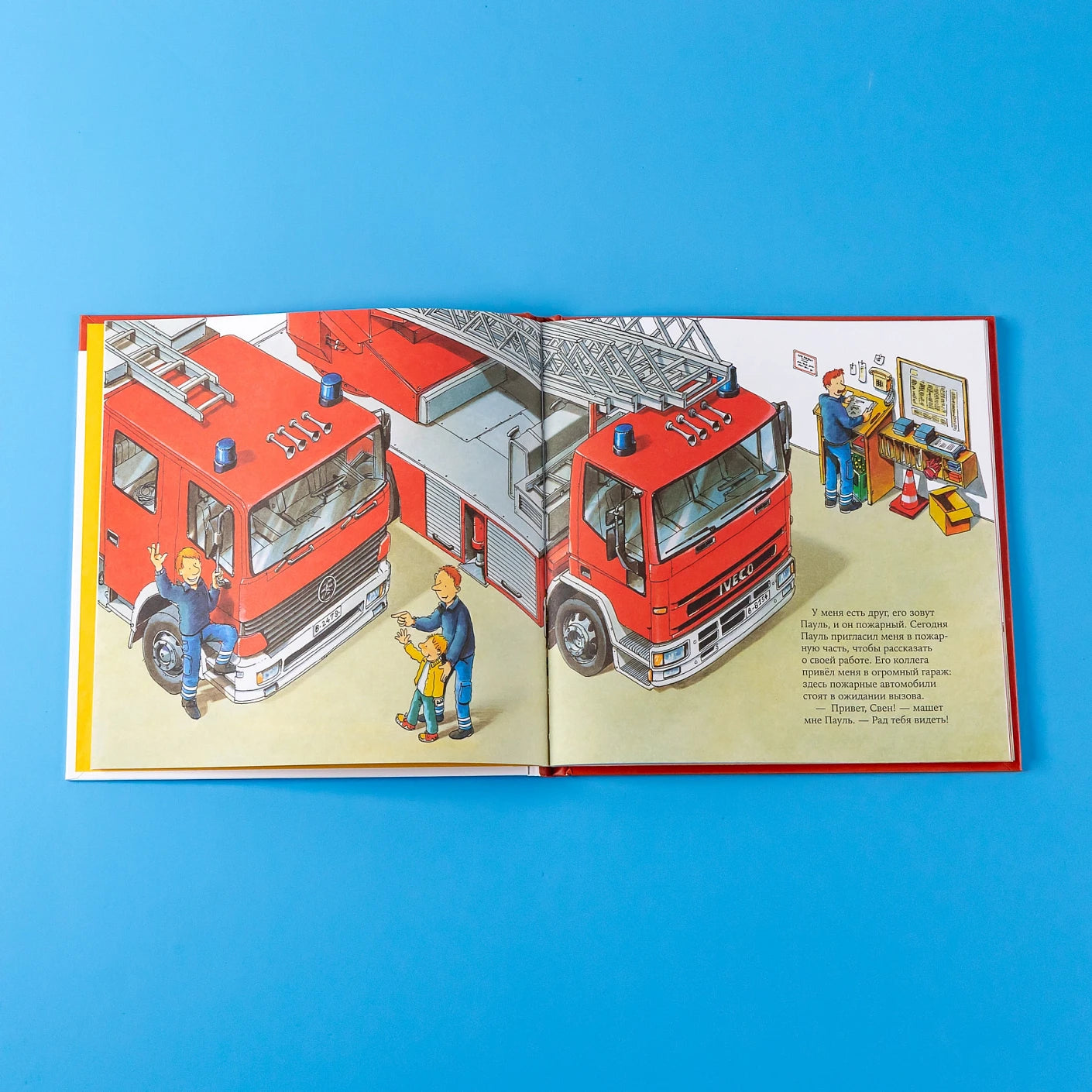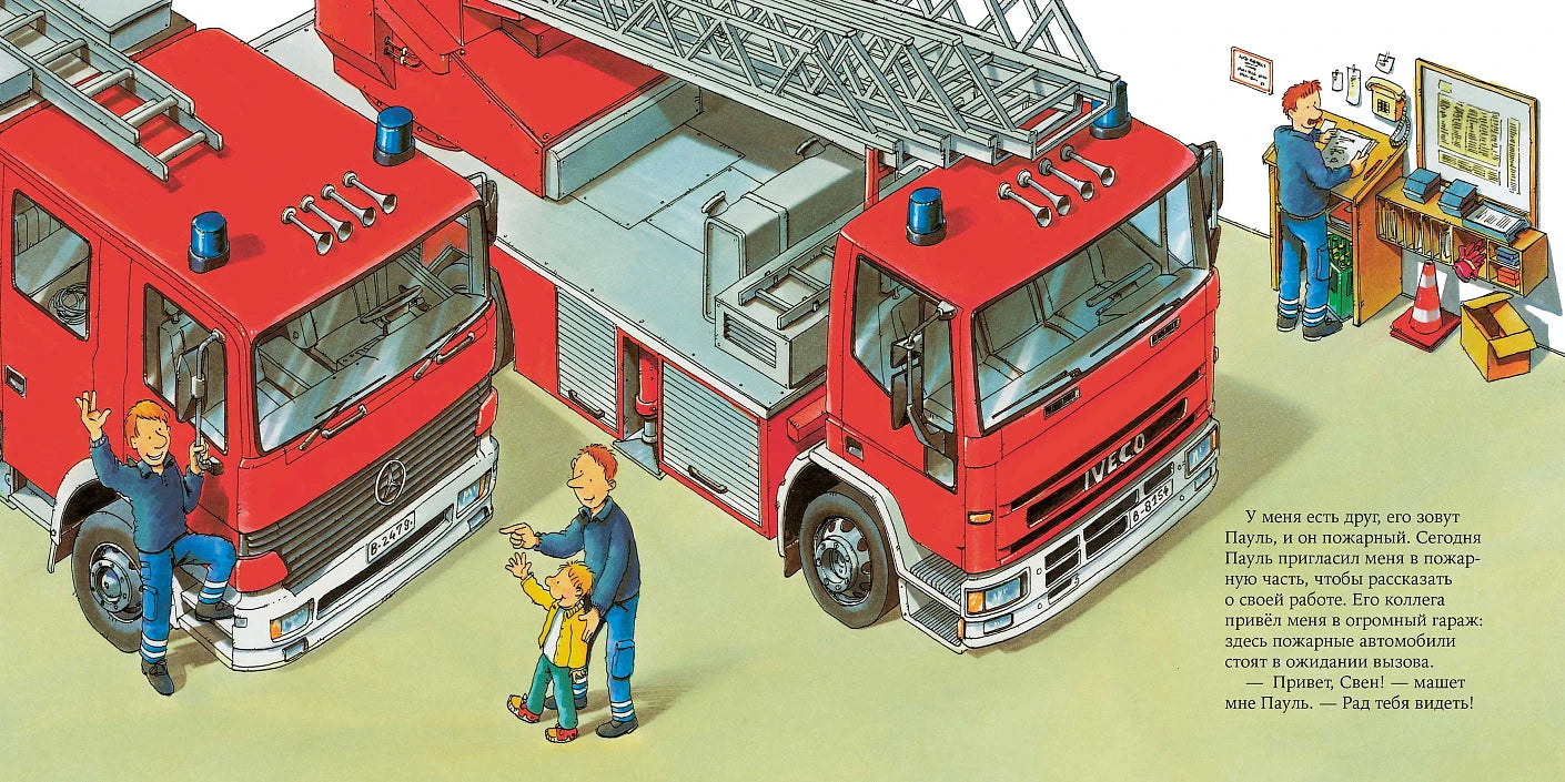 Все книги построены по принципу «один день из жизни...»: герои историй, дети, приходят в гости на работу к своим взрослым знакомым. В этой книге мальчик Свен вместе со своим другом Паулем знакомится с профессией пожарного. Вы узнаете, что находится внутри пожарной машины, что происходит в дежурно-диспетчерском центре, для чего пожарные натягивают штаны на сапоги и многое другое!