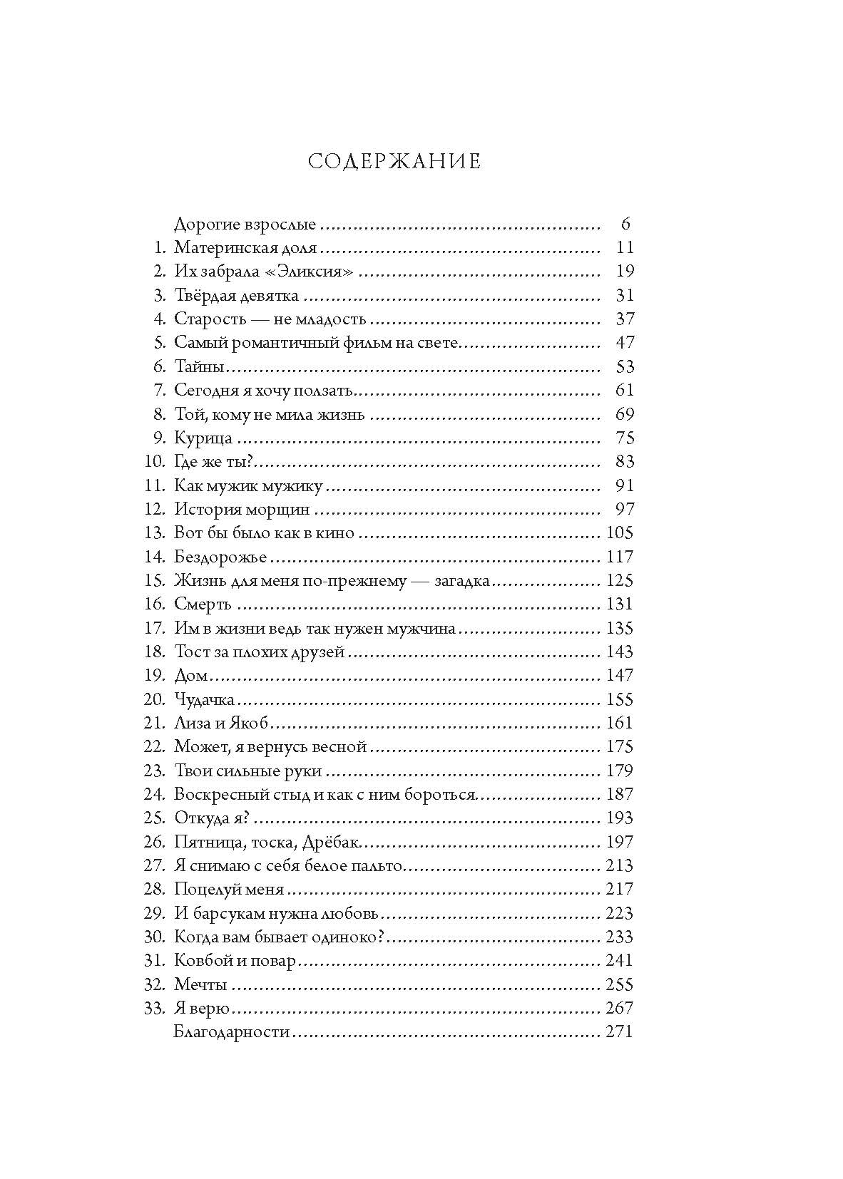В форме новелл, художественных монологов, диалогов, стихотворений в прозе и миниатюр она пишет о морщинах, культе тела, одиночестве, желаниях, расставаниях, маленьких и больших тревогах, любви и запахах, которые остаются с нами навсегда.