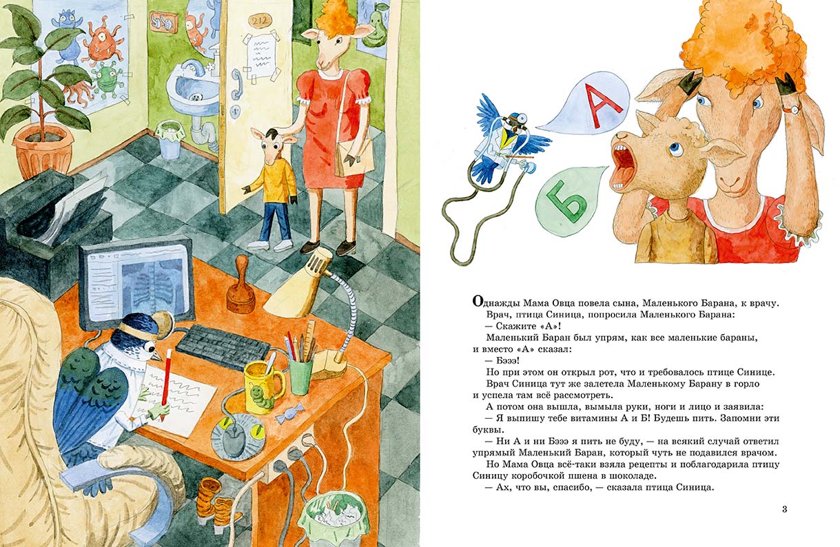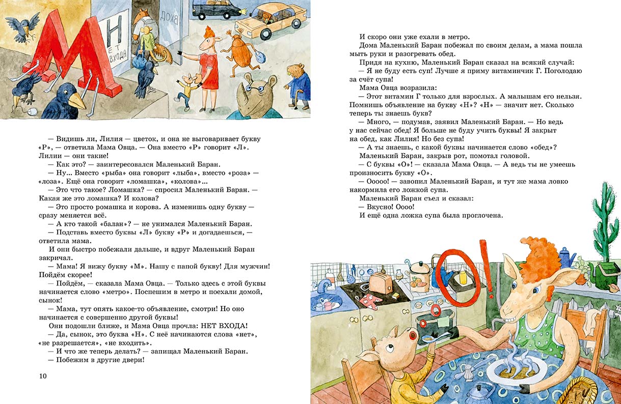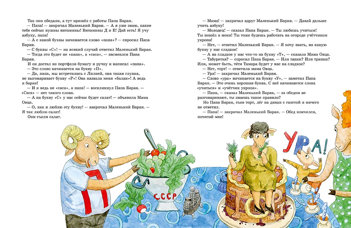 Существует множество весёлых методик и пособий, как выучить с ребенком буквы. Мама Овца, недолго думая, применила отличный способ. Как бы мимоходом, по дороге домой и дома за ужином она обращала внимание Маленького Барана на первые буквы вывесок или каких-либо нужных в обиходе слов. К букве «И» она привязала слово «извините», к «К» – название магазина «Книги», к «О» – обед, к «П» – конечно, «папа». И Маленький Баран моментально эти буквы запомнил. Да и как, например, не запомнить букву «У» – ведь Папа Баран работает Учётчиком Укропа!