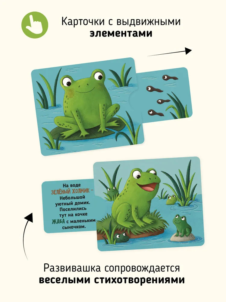 Развивающие карточки "Тяни и смотри" познакомят вашего малыша с миром животных и их домиками. Каждая из 16 карт содержит яркое, милое изображение животного с выдвижным элементом, который показывает, где живет этот зверь, птица или насекомое. Где живёт семейство мышек, торопливых муравьишек, бегемоты, осьминоги? Ответы ждут на каждой интерактивной задвижке!