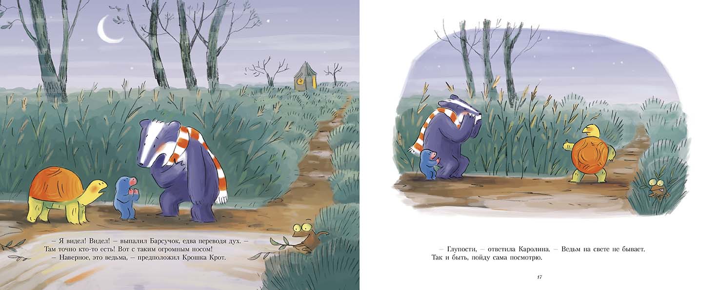 Следы привели их к хижине на болоте, и первым на разведку отправился Барсучок. С виду он храбрился, но внутри был немного трусишкой. А поскольку у страха глаза велики, то издалека ему показалось, что в хижине поселилась носатая злая ведьма.