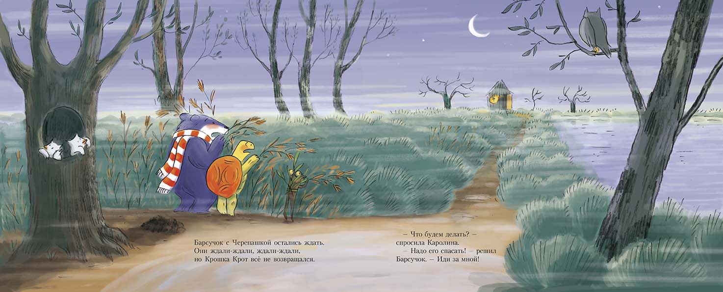 Наконец, к хижине отправился самый младший участник экспедиции, Крошка Крот. Он очень долго не возвращался, и Барсучок с Черепашкой пошли его спасать.