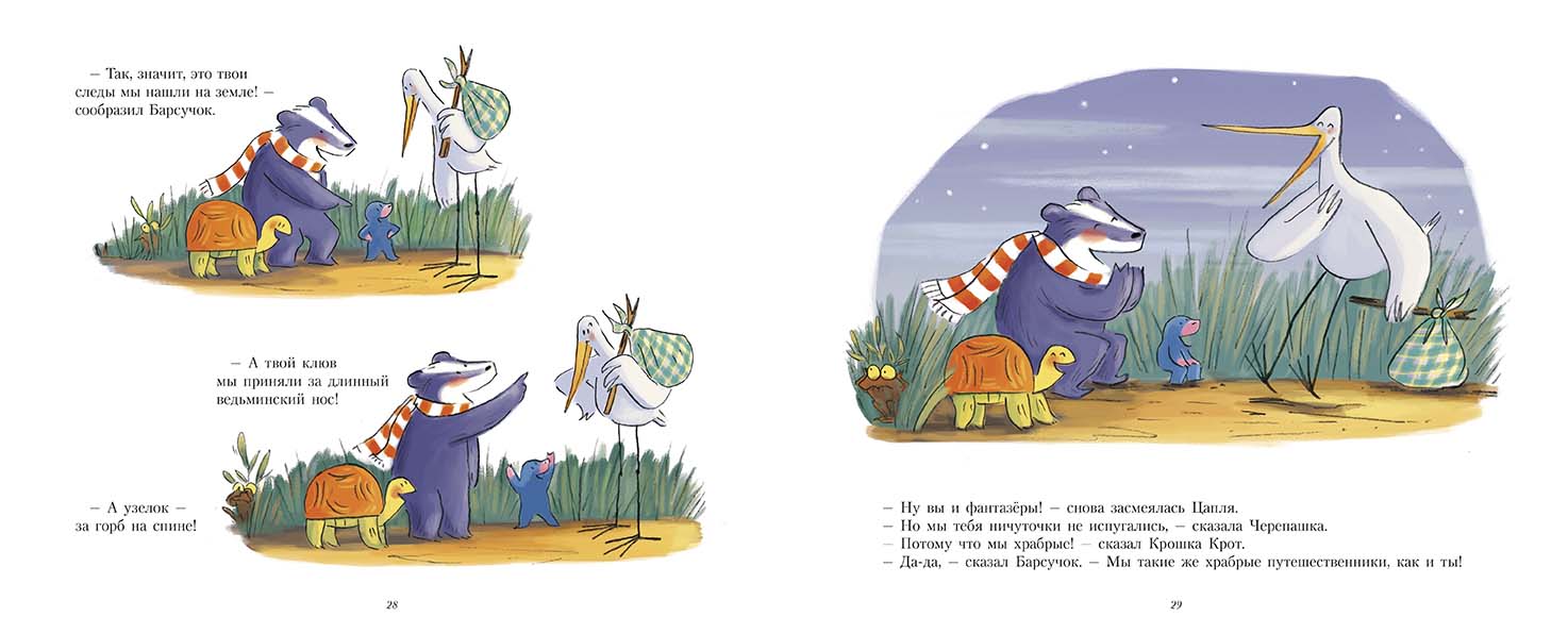 К счастью, эта история закончилась благополучно. Загадочным болотным жителем оказалась Цапля, которая была в тех местах пролётом. Познакомившись с ней поближе, друзья перестали её бояться и даже все вместе посмеялись над своими прежними страхами.
