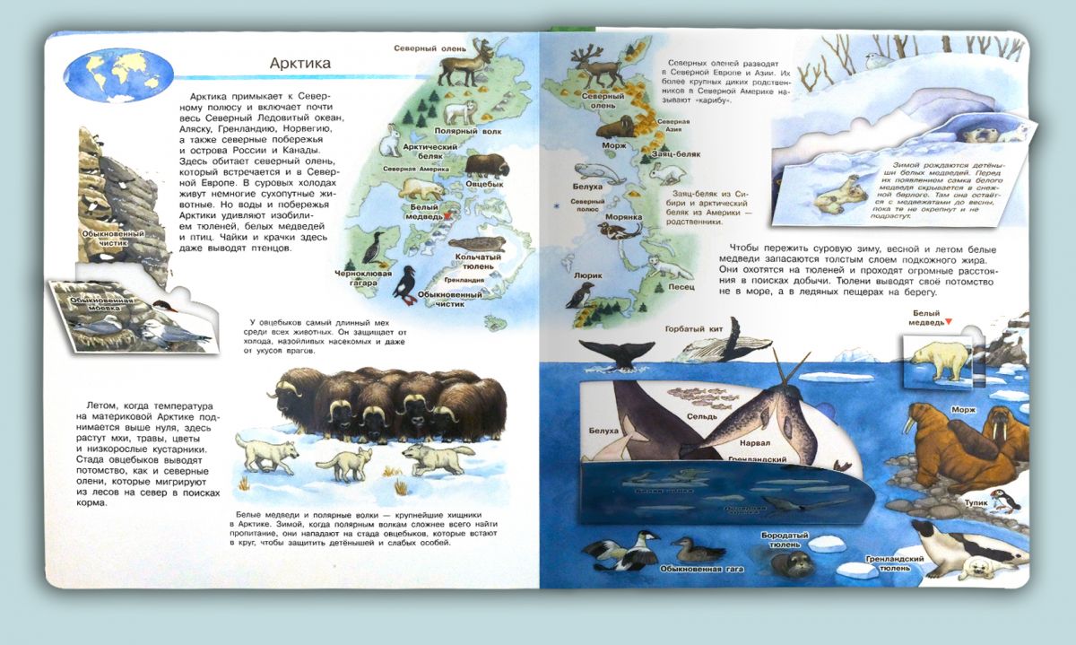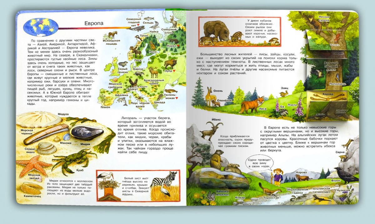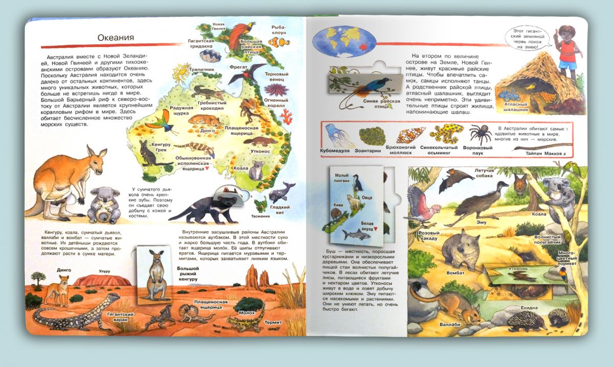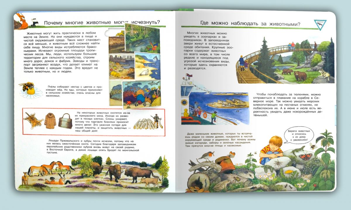 Каждый книжный разворот энциклопедии насыщен массой интереснейшей информации, красочно и занимательно описывающей великое многообразие различных форм и видов животного мира, а также природных условий и мест обитания.