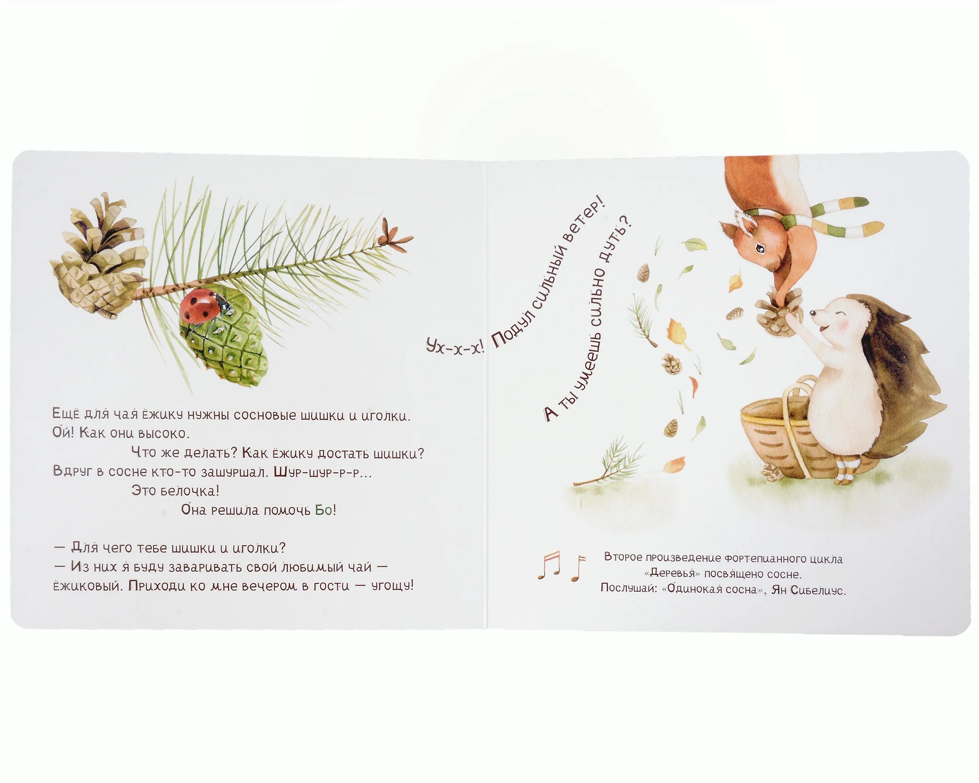 Этот цикл умиротворяющих, нежных, трогательных произведений идеально подойдет для чутких слушателей, а также для первого знакомства с огромным миром классической музыки. Он состоит из 5 произведений: сосна, осина, ель, береза, рябина. Каждому дереву посвящен отдельный разворот книги, а финальный шестой - логически завершает путешествие ежика Бо завариванием травяного чая.