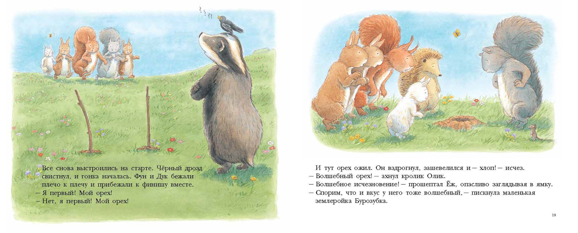 С первой и до последней страницы эта история держит ребенка в напряжении. Малыш следит за тем, как ссорятся и спорят Фун и Дук, как пытаются хитрить кролик Олик и Ёж, как дядюшка Барсук старается навести порядок и рассудить по справедливости. Взрослый уже догадывается, что за кучки земли вырастают в траве и кто скрывается под скорлупой ореха, но ребенок еще только познает мир и впереди его ждут удивительные открытия.