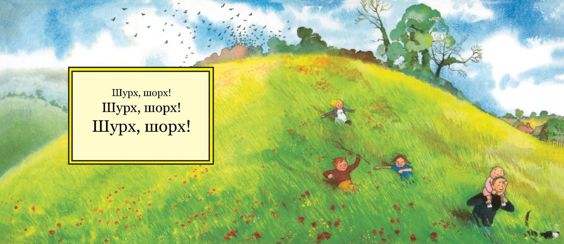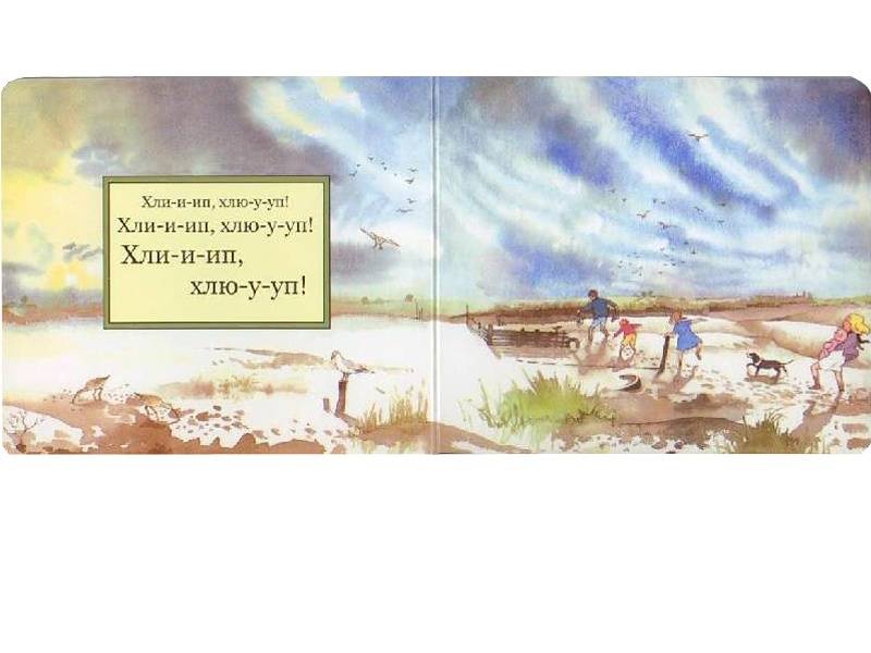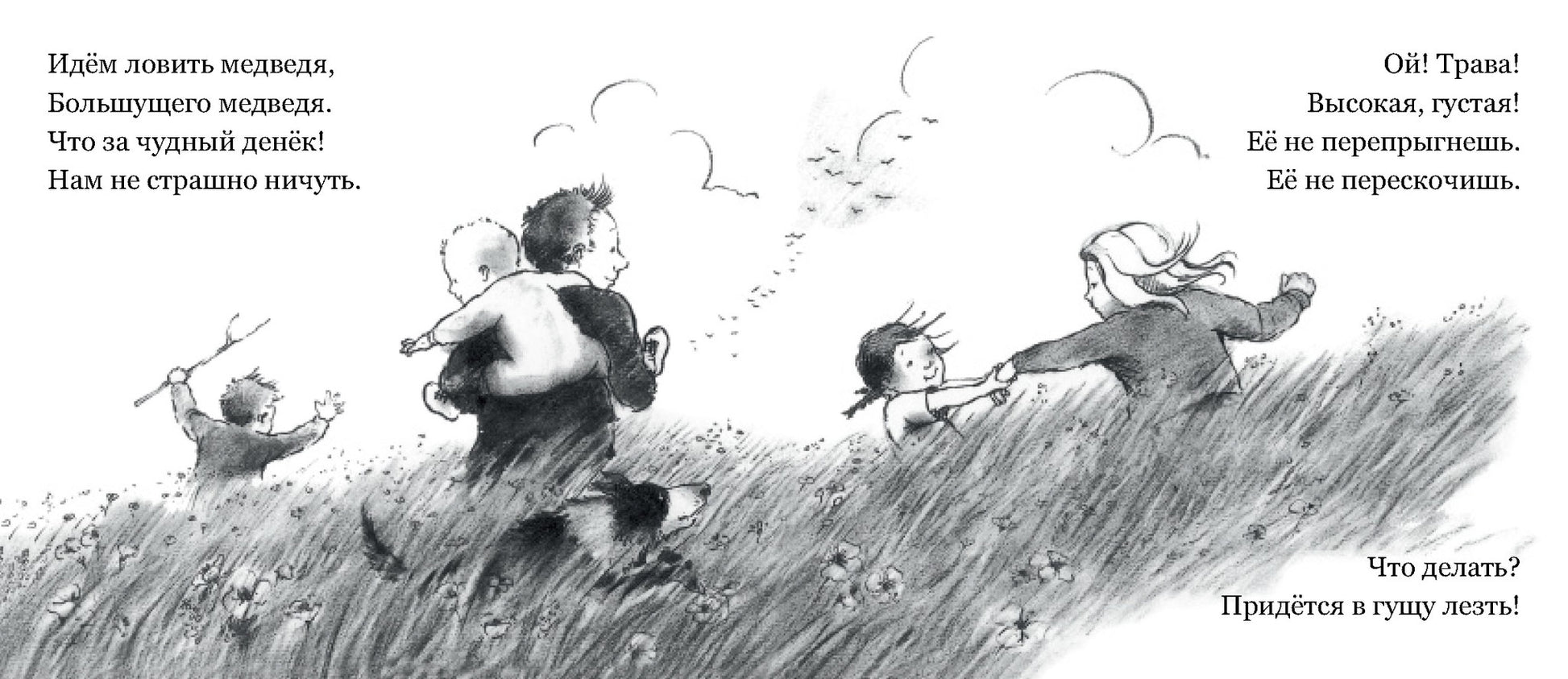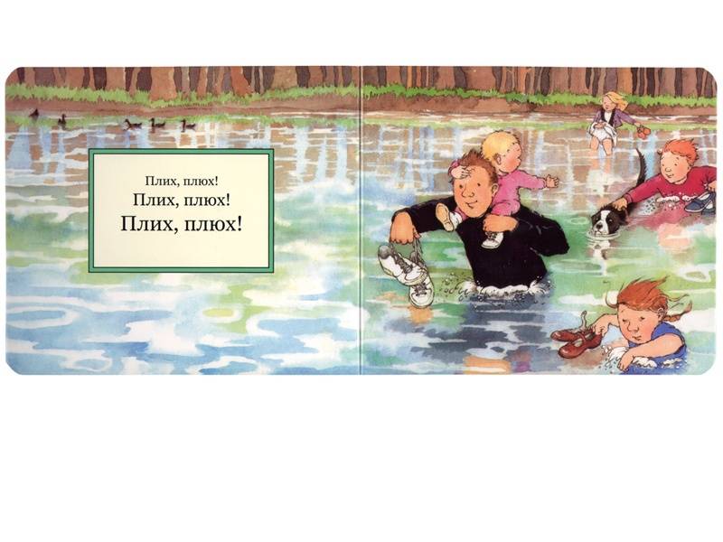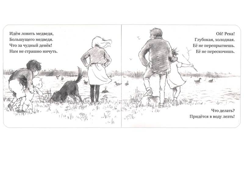 Эта замечательная книжка – не просто книжка, это книжка-игра, книжка-спектакль. Читая ее, скорее даже напевая, можно изображать, как тяжело пробираться сквозь высокую траву, и какие звуки при этом получаются – прислушайтесь: «Шурххх! Шорххх!» А еще можно шлепать через речку, вязнуть в болоте, проламываться через сучья в лесной чаще, бороться с сильным ветром и осторожно, на цыпочках углубляться в пещеру. Эта книжка станет любимой и у совсем маленьких читателей, и у младших школьников, которые смогут читать ее самостоятельно. Ну а спектакль «Идем ловить медведя» можно показывать всем семейством!