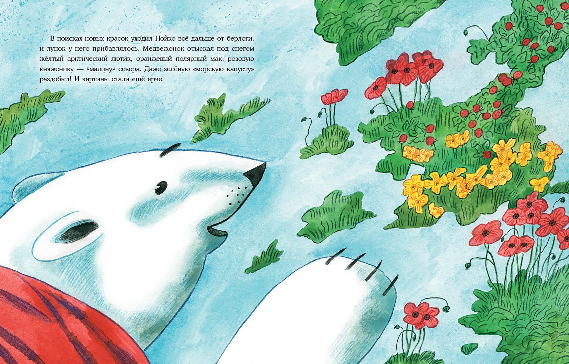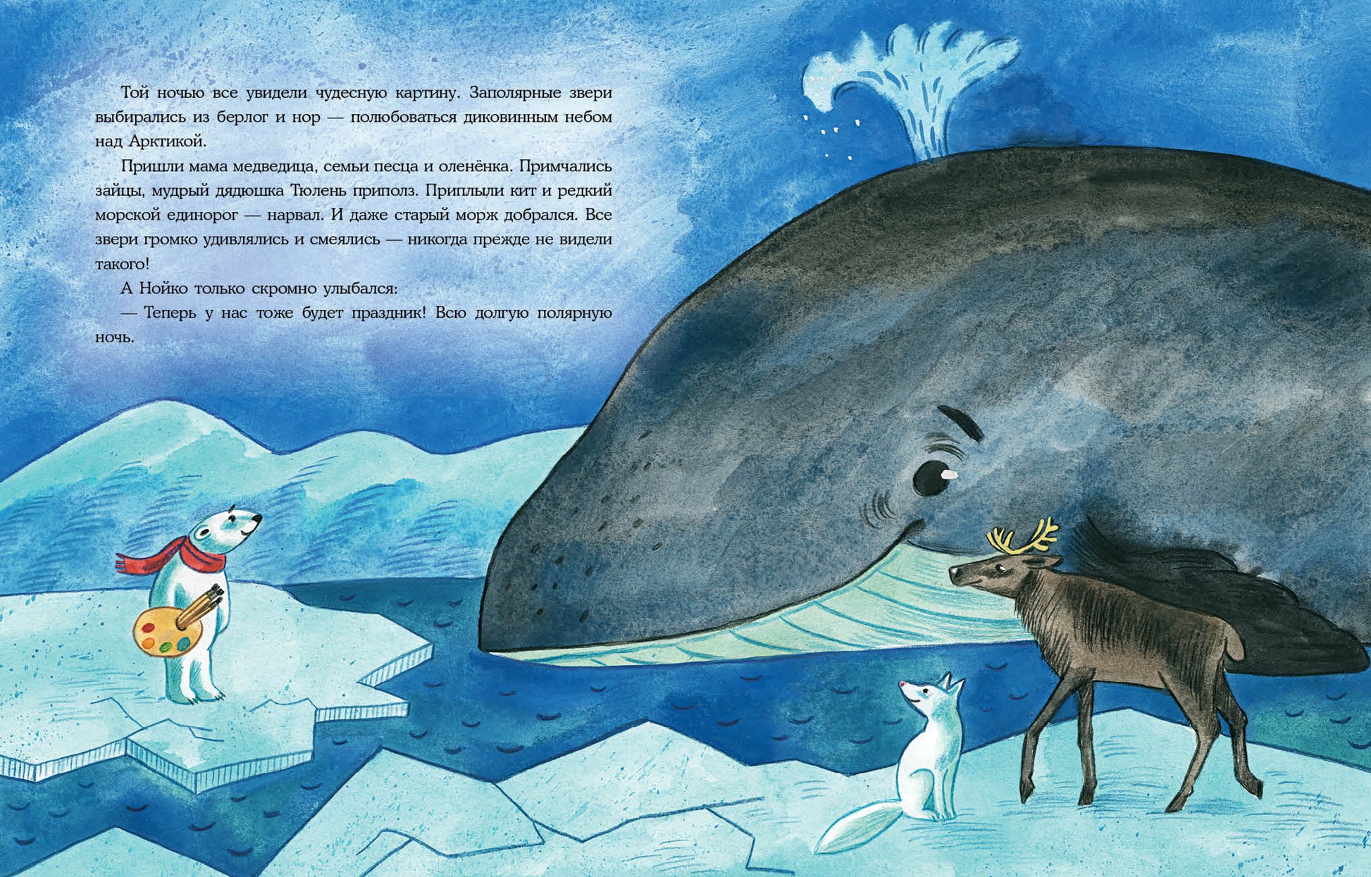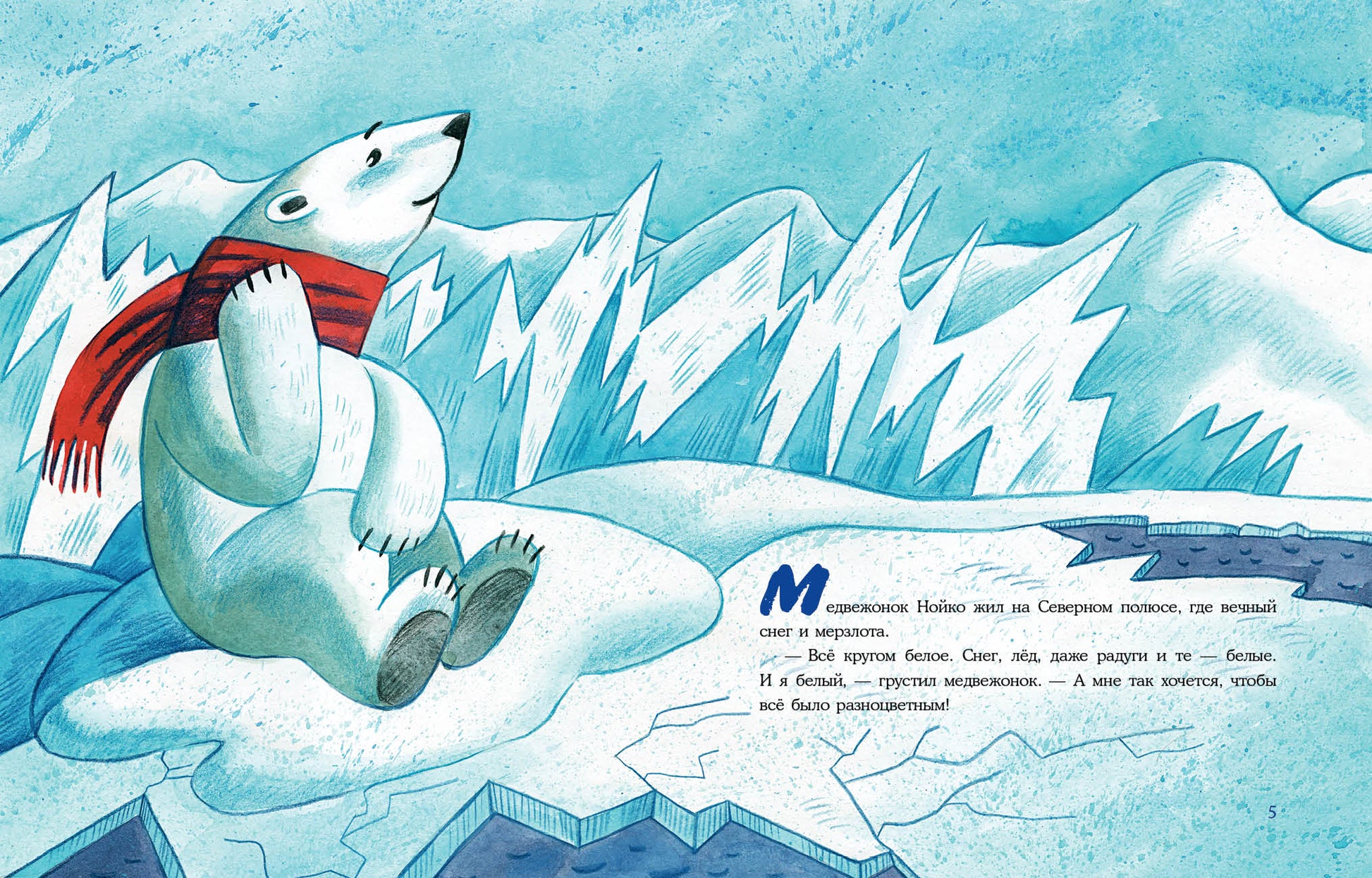 Медвежонок Нойко живёт на Северном полюсе, среди снега и вечной мерзлоты. Всё вокруг белое-белое — и сам Нойко тоже! Только когда наступает полярная ночь, всё становится синим и фиолетовым. А малышу так хочется ярких разноцветных красок! Дядюшка Тюлень даёт медвежонку отличный совет — почему бы ему самому не раскрасить Заполярье в те цвета, какие захочется? Нойко и его друзья с радостью принимаются за дело…