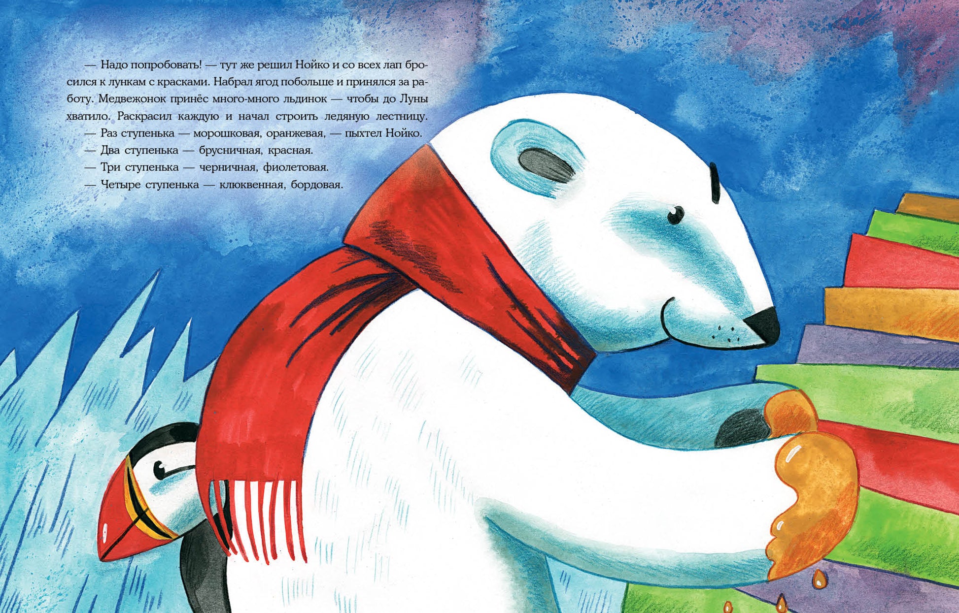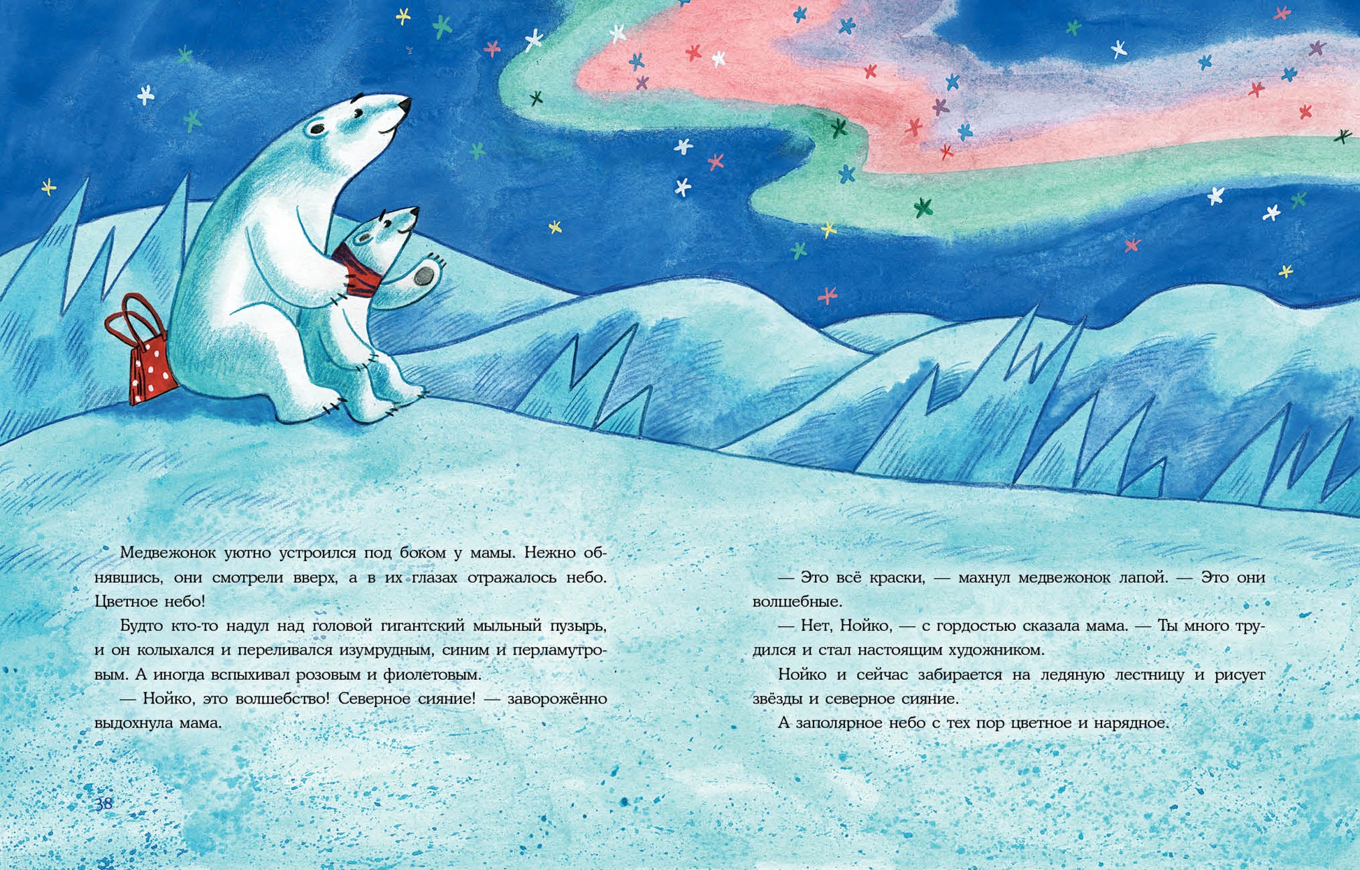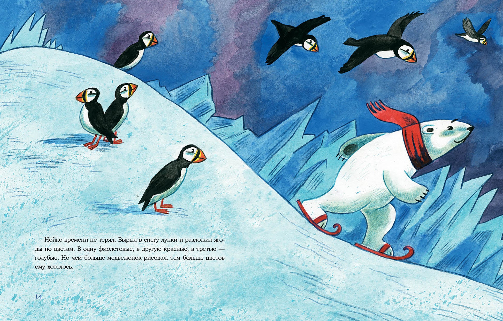 Медвежонок Нойко живёт на Северном полюсе, среди снега и вечной мерзлоты. Всё вокруг белое-белое — и сам Нойко тоже! Только когда наступает полярная ночь, всё становится синим и фиолетовым. А малышу так хочется ярких разноцветных красок! Дядюшка Тюлень даёт медвежонку отличный совет — почему бы ему самому не раскрасить Заполярье в те цвета, какие захочется? Нойко и его друзья с радостью принимаются за дело…