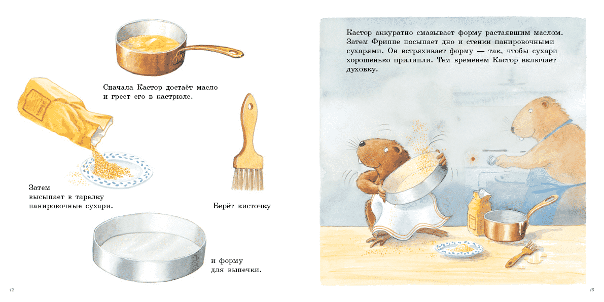 В книге «Кастор печет пирог» Кастор вместе со своим другом бобренком Фриппе пекут настоящий именинный пирог по случаю дня рождения Кастора. Они замешивают тесто из нужных ингредиентов, взбивают его миксером, выкладывают в посыпанную сухарями форму, ставят в духовку и ждут, когда пирог зарумянится. Подробный рецепт этого несложного, но очень вкусного пирога приводится в конце книги, чтобы после прочтения сказки родители и дети могли отправиться на кухню и приготовить точно такой же пирог по всем правилам настоящих кулинаров.