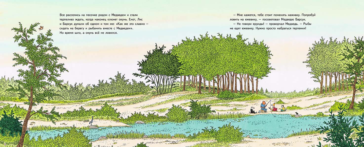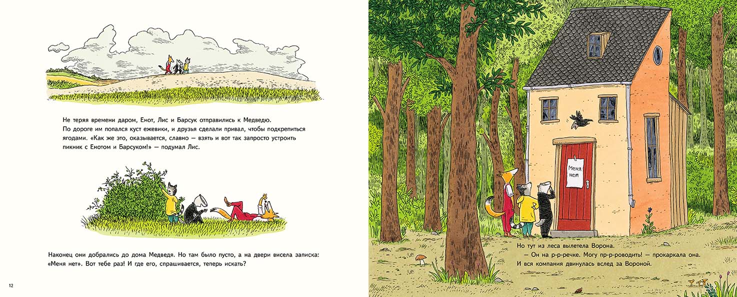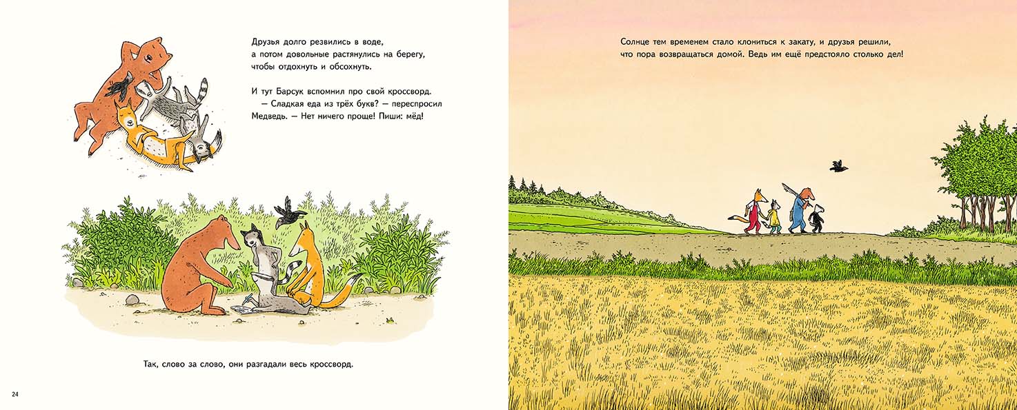 Всё началось с того, что утром Енот захотел испечь яблочный пирог, но оказалось, что в холодильнике нет яиц. За яйцами Енот отправился к соседу Лису, который держал кур. Лис был занят починкой крыши и посетовал, что у него нет лестницы. За лестницей они вдвоём пошли к Барсуку, у которого всегда всё есть. Барсук в это время разгадывал кроссворд и никак не мог подобрать нужное слово. За помощью они отправились к Медведю, по пути встретив Ворону, которая вызвалась их проводись. По дороге друзья рассказывали друг другу смешные истории, собирали ежевику и спускались с обрыва как заправские альпинисты. Медведя они нашли на берегу реки – он удил рыбу, но у него всё никак не клевало. В итоге рыбалка закончилась всеобщим купанием, после которого друзья еще долго валялись на песке и разгадывали кроссворд. Под вечер они зашли за лестницей к Барсуку, починили крышу Лису и приготовили яблочный пирог в гостях у Енота. А потом пили чай на веранде и каждый думал: «Как же это здорово – вдруг взять и провести целый летний день с друзьями!»