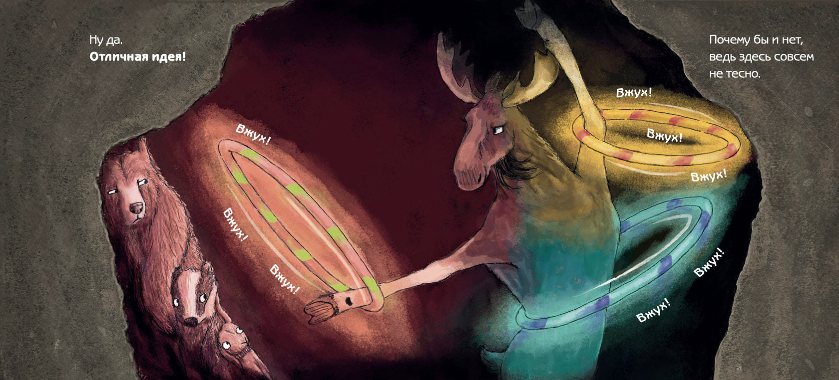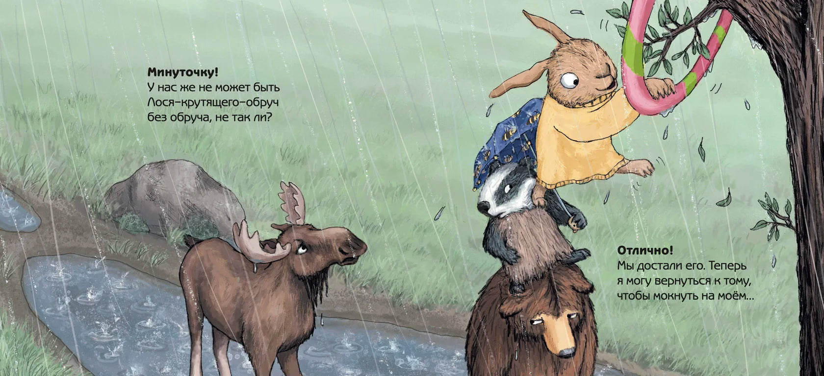 Для Медведя и его друзей все кажется очень унылым. Как можно веселиться, когда всё насквозь промокло? Но Мисс Барсук, Кролик и Лось, похоже, не обращают на это внимание. Лось мастерски крутит хула-хуп и это так забавно! Может быть медведю тоже стоит попробовать?