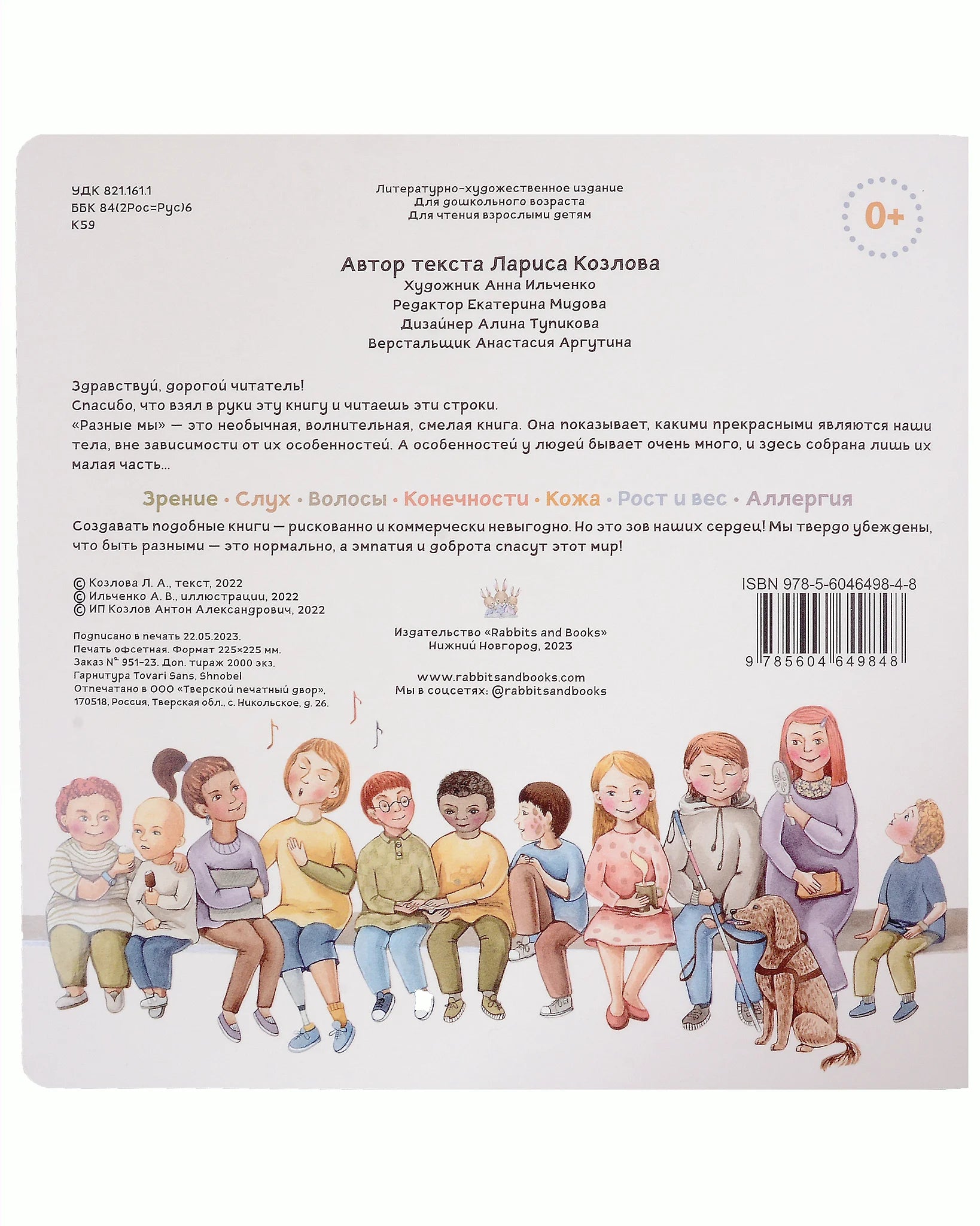 В "Разные мы" автор Лариса Козлова и художник Анна Ильченко показывают детей и людей в инвалидной коляске, полностью лысых, худых и полных, с протезами, витилиго, разным цветом глаз, слуховыми аппаратами, собакой-поводырем, низкорослых и высоких... Эта книга создана с целью показать, что абсолютно нормально быть уникальным, выделяться. Она получилась особенная по всем форматам: нежная и трогательная, веселая и беззаботная, одновременно с этим, серьезная, очень важная и порой тяжёлая.