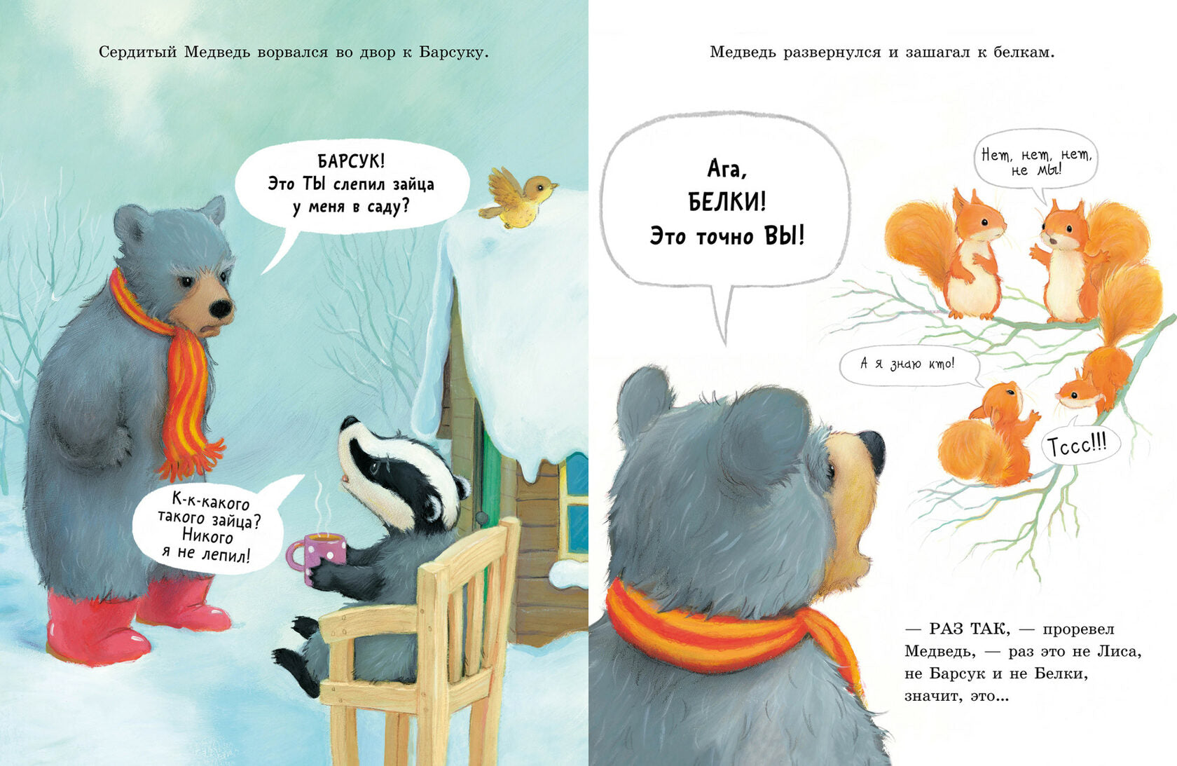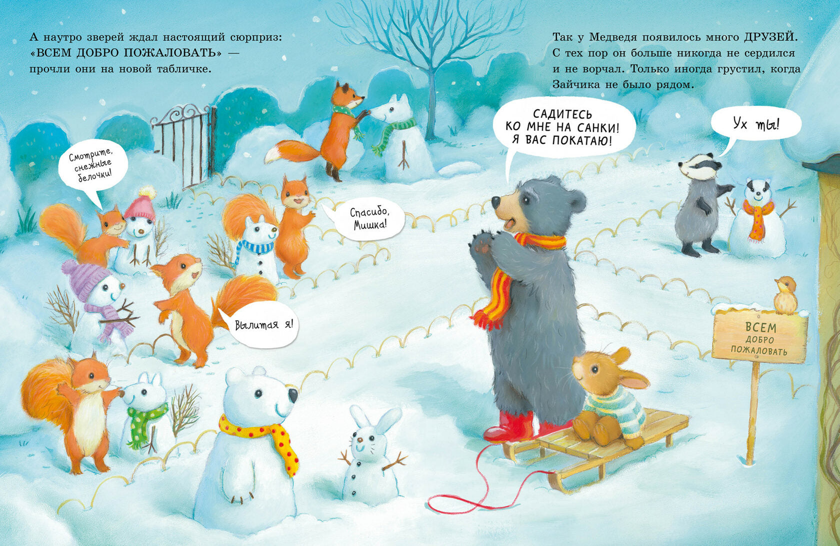 Все звери боялись Медведя – все, кроме одного маленького улыбчивого зайчика. «Бедный, бедный Медведь, – думал Зайчик. Грустно ему, наверное, живется одному. Вот бы его чем-нибудь порадовать!» И он решил слепить в медвежьем саду снеговика надеясь, что Медведю понравится сюрприз. Но не тут-то было!