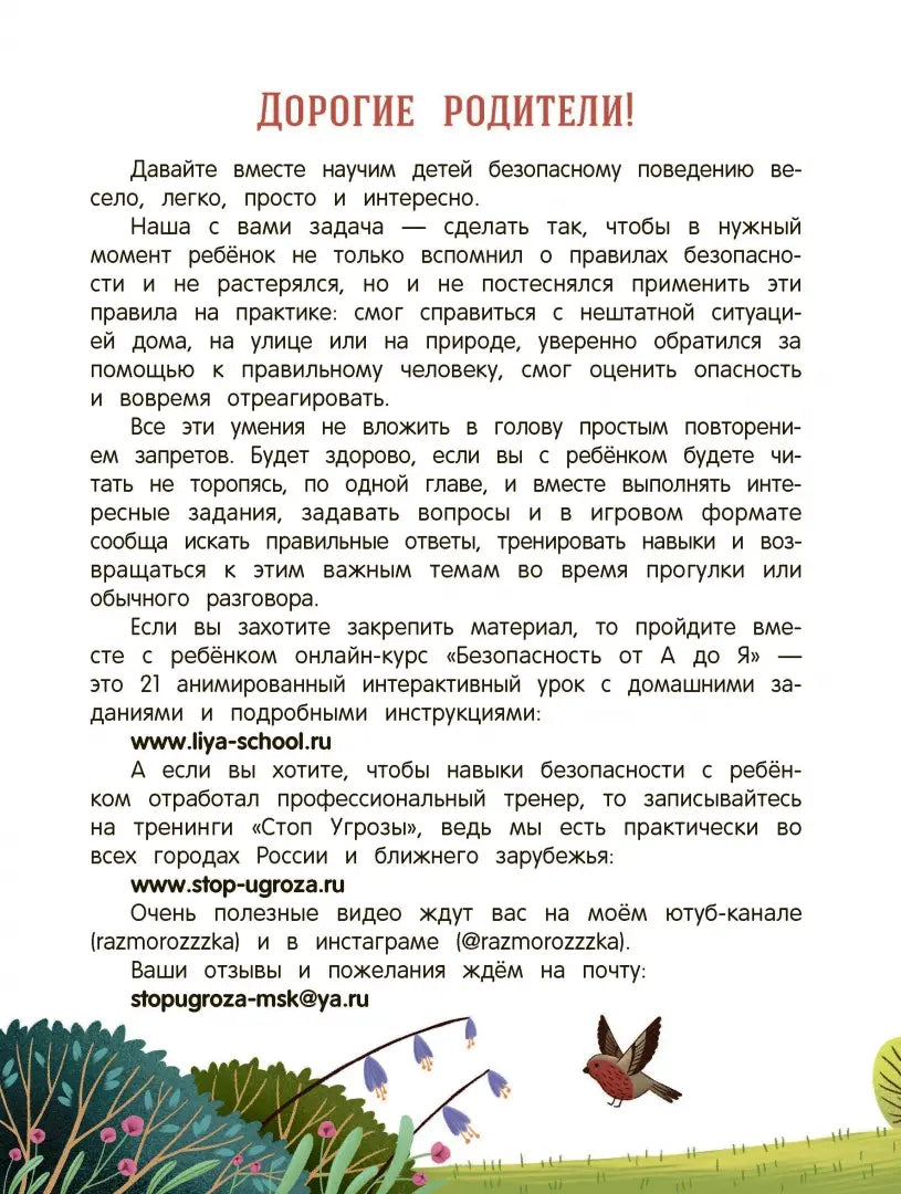 В этой книге Лия Шарова, создатель школы безопасности "Стоп Угроза", опираясь на свой многолетний опыт работы с детьми, собрала информацию, которая поможет в увлекательной и доступной форме обсудить с ребёнком ключевые правила безопасного поведения дома и на улице, в лесу и у водоёма, а также в других местах.