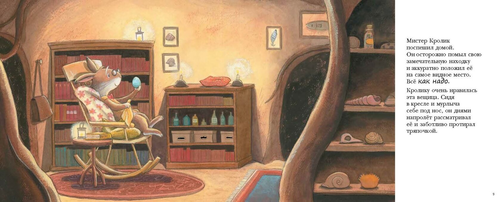 У Мистера Кролика было две страсти: он обожал наводить порядок в своей чистенькой аккуратной норке и коллекционировать разные красивые вещи. Однажды он нашёл в лесу и принёс к себе в дом удивительный предмет – гладкий, круглый, такой приятный на ощупь!
