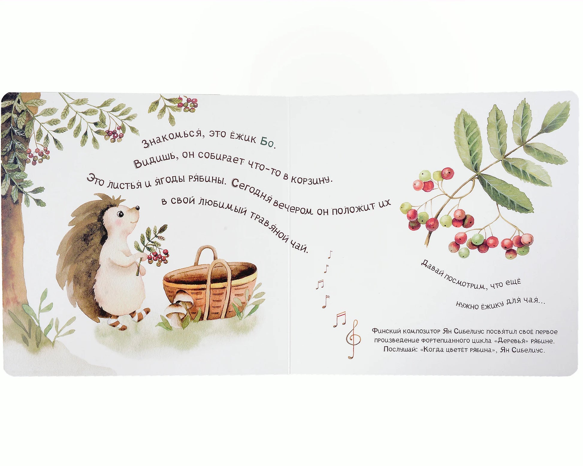 Этот цикл умиротворяющих, нежных, трогательных произведений идеально подойдет для чутких слушателей, а также для первого знакомства с огромным миром классической музыки. Он состоит из 5 произведений: сосна, осина, ель, береза, рябина. Каждому дереву посвящен отдельный разворот книги, а финальный шестой - логически завершает путешествие ежика Бо завариванием травяного чая.